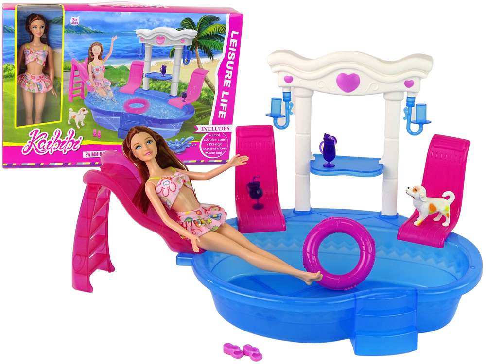 Zjeżdżalnia do basenu dodaje dodatkowej dawki zabawy. W zestawie znajdują się dwa fioletowe drinki oraz stylowe różowe klapki, które pozwolą lalce cieszyć się wakacyjnym klimatem. Oprócz tego, w zestawie znajduje się także koło do pływania dla lalki, aby maluch mógł tworzyć jeszcze więcej opowieści pełnych akcji.