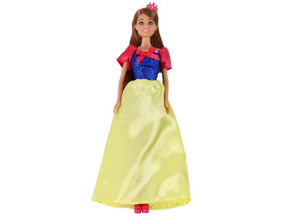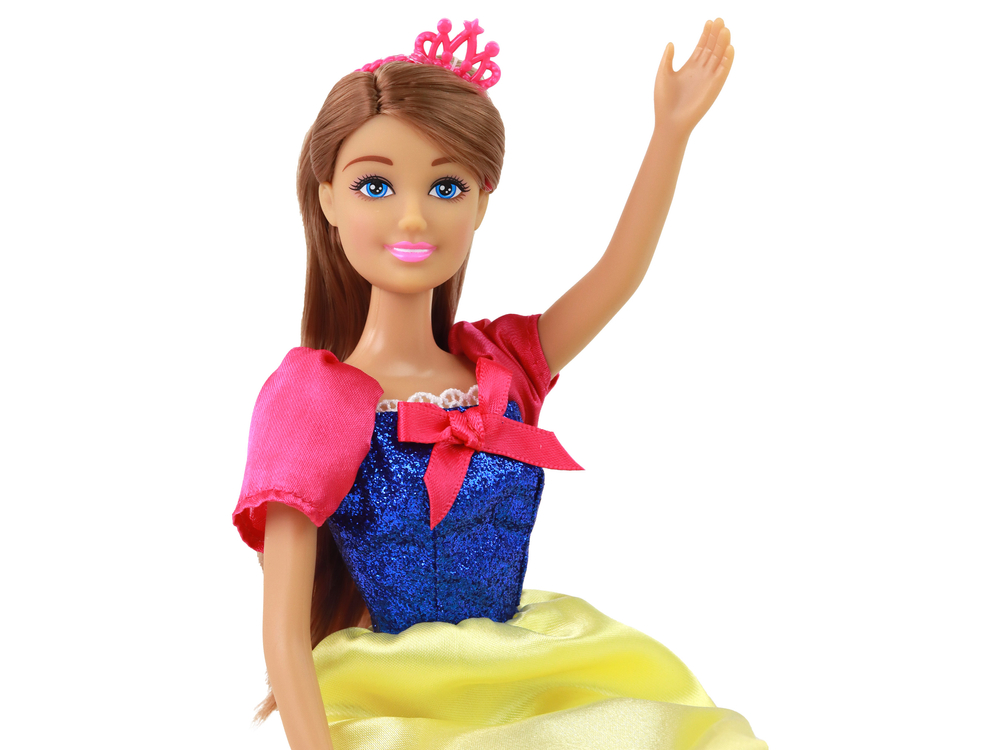 Lalka nosi na głowie różową opaskę z koroną, a jej ubiór to prawdziwy klejnot mody. Górna część sukienki to niebieski brokat z różowymi rękawami i kokardą, a dół zachwyca gładkim, żółtym materiałem. Różowe sandałki na obcasie dodają całej stylizacji elegancji.