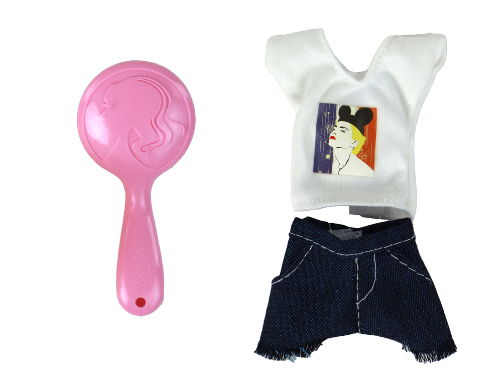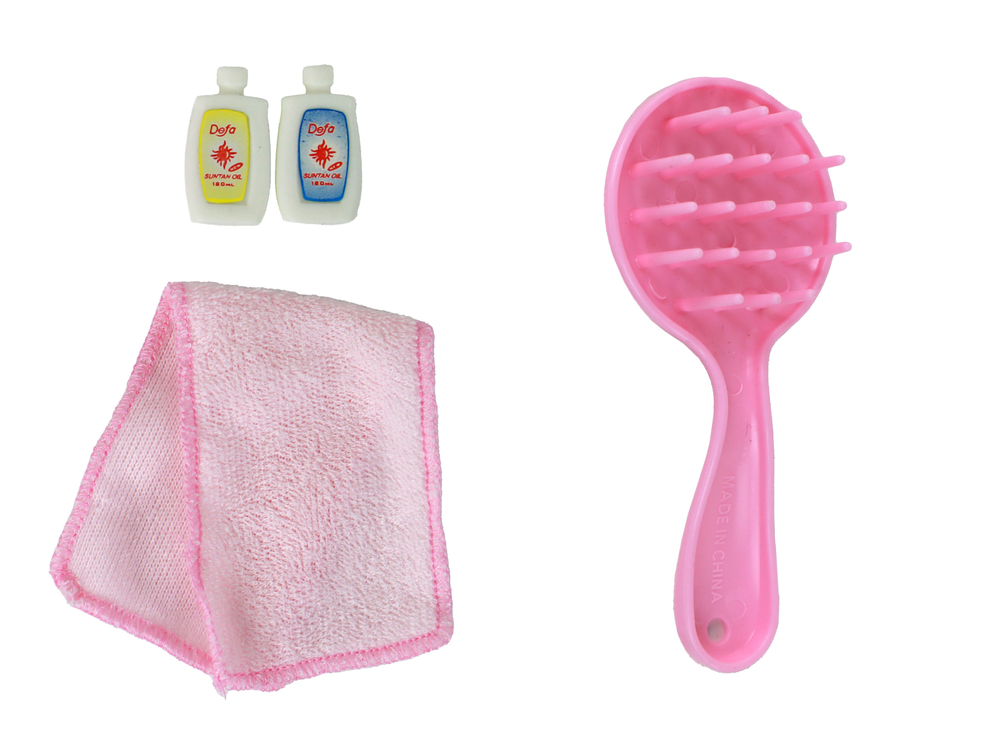 W zestawie znajdują się dodatki, które umożliwiają pełną opiekę nad lalką. Różowy ręcznik, różowa szczotka do włosów, 2 olejki do opalania, jeansowe spodenki, bluzka z krótkim rękawkiem, biała wanna o wymiarach 23 cm x 10 cm x 13 cm.