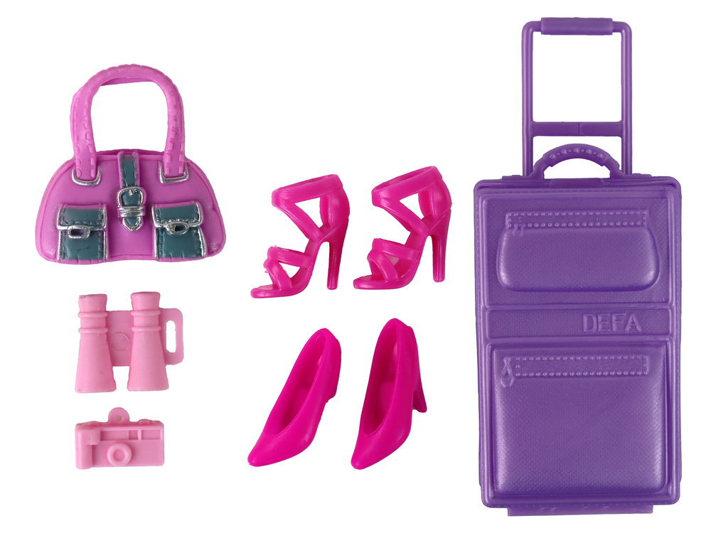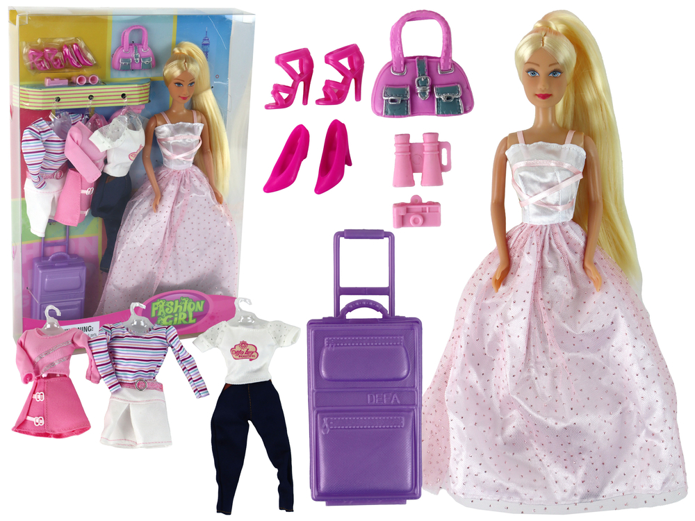 Oto wyjątkowa lalka, idealna do kreatywnej zabawy w podróże. Jej długie, blond włosy można czesać i eksperymentować z różnymi fryzurami, co rozwija kreatywność dzieci. Lalka ubrana jest w elegancką suknię zdobioną tiulem i brokatem, a jej niebieskie oczy dodają uroku. W zestawie znajdują się także dwie pary różowych butów na obcasie, fioletowa otwierana walizka (8 cm x 5 cm x 3 cm) z wysuwaną rączką, różowa torebka, aparat i lornetka, co pozwala na różnorodne przygody i role do odgrywania. Dodatkowo, zestaw zawiera trzy różne zestawy ubrań, w tym spódnicę z brokatowym paskiem i bluzkę z długim rękawkiem w paski, różową spódnicę z różową bluzką oraz ciemne spodnie z białą koszulką z koronkowym, krótkim rękawkiem zdobionym brokatem.
