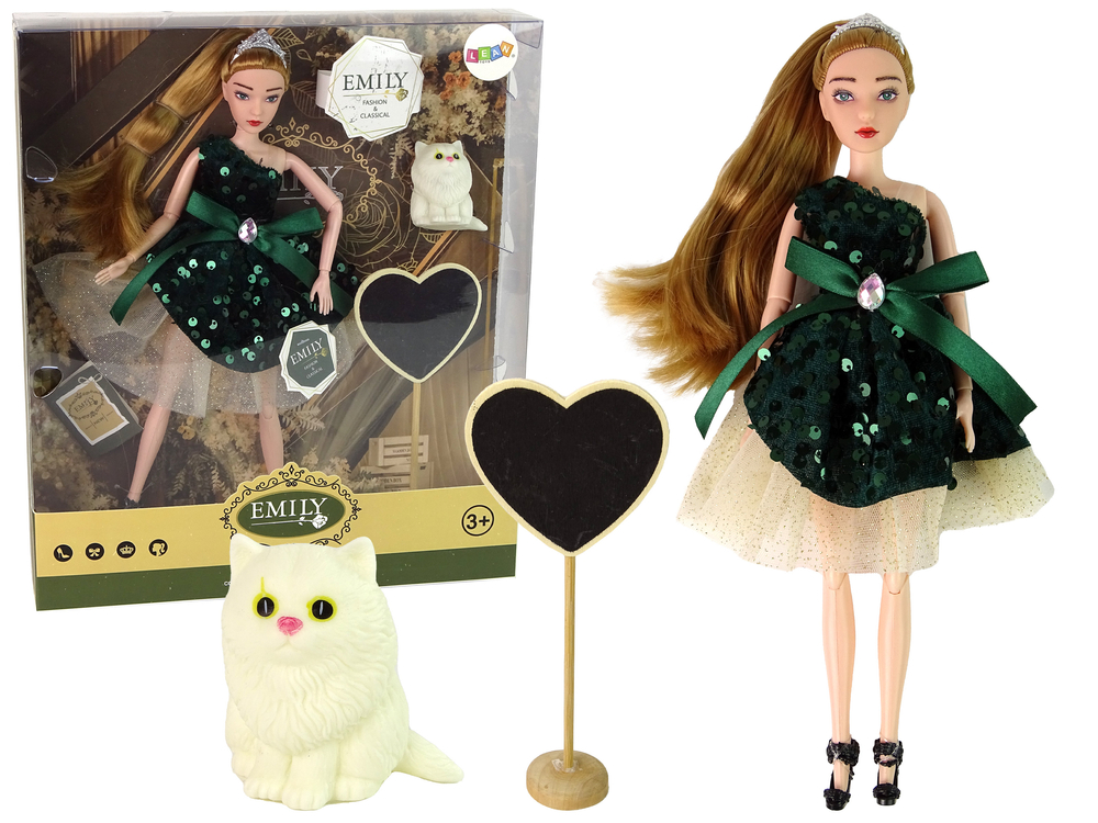 Przedstawiamy uroczą lalkę Emily z długimi blond włosami, ubraną w elegancką suknię w kolorze butelkowej zieleni, zdobioną zielonymi cekinami i kokardą. Jej uczesane włosy w kucyk zdobi tiara, a zielone oczy dodają uroku. Lalka ma ruchome kończyny, dzięki czemu realistycznie się porusza.