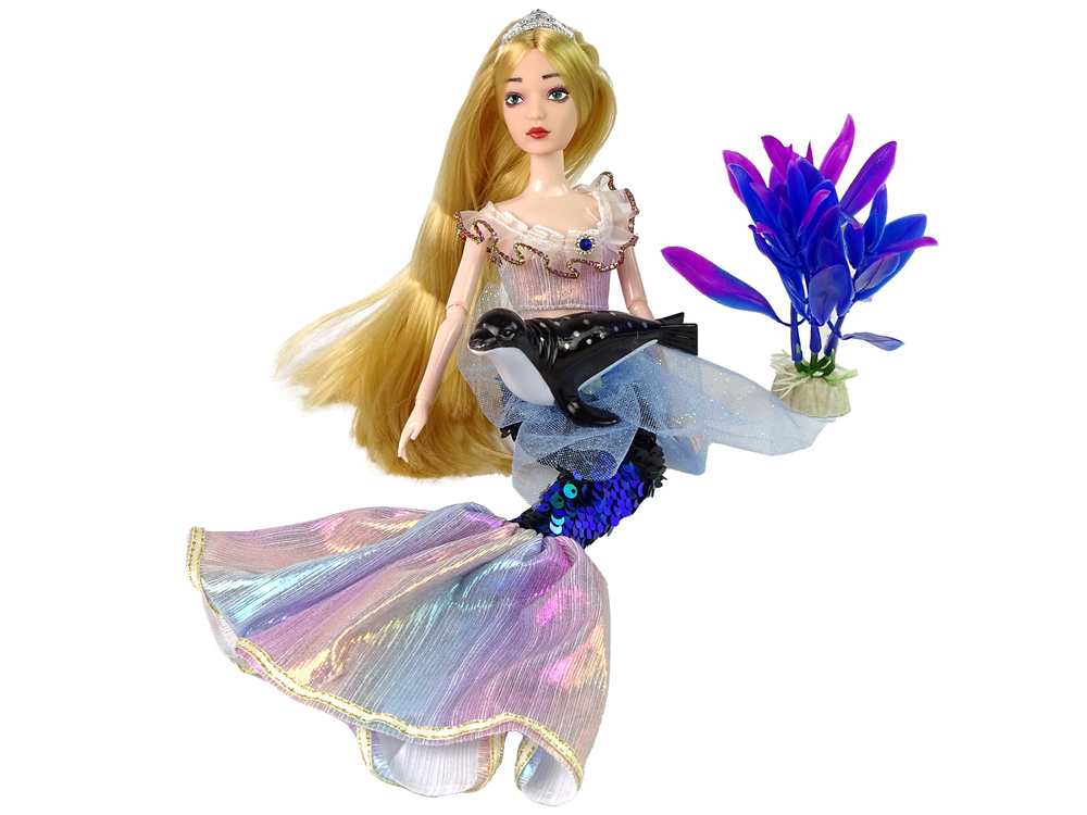 Nie tylko ogon przyciąga uwagę – piękna bluzka z falbanami dodaje uroku i charakteru Emily. To jednak nie koniec atrakcji w tym zestawie. Oprócz lalki Emily Syrenki, znajdziesz tu także uroczą czarną fokę w srebrne kropki ( 10 cm x 4,5 cm x 5,5 cm ) oraz uroczo zdobioną fioletowo-różową roślinkę morską ( 13 cm x 4 cm x 3 cm ), które wzbogacają świat podwodnych przygód.