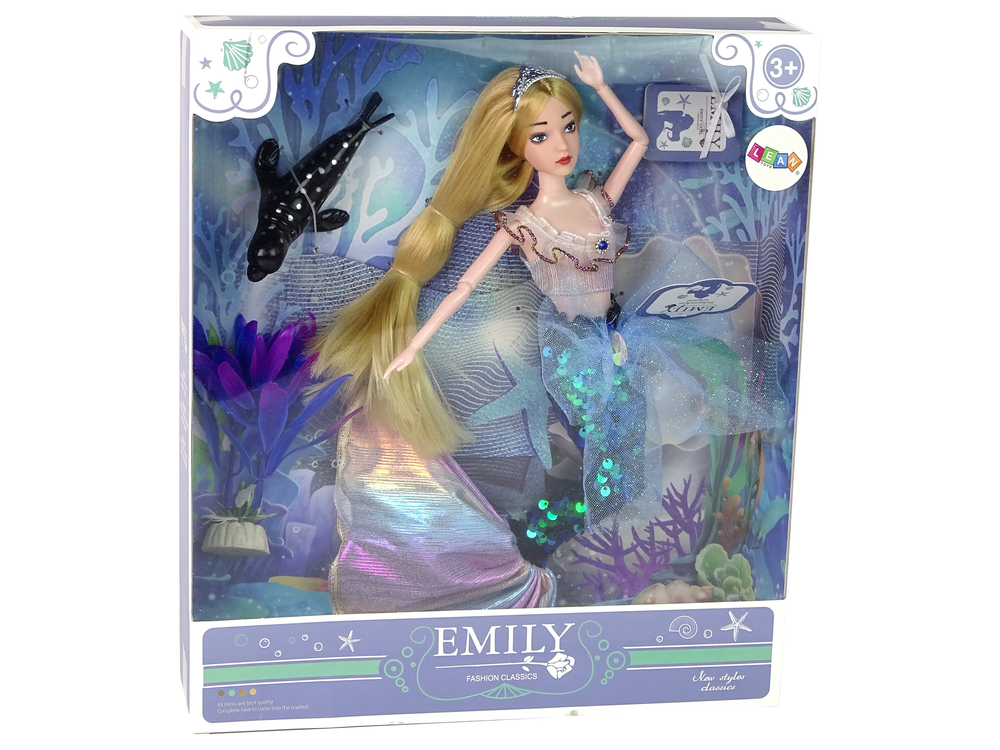 Przywitaj się z lalką Emily Syrenką, która zaprasza do magicznego świata podwodnych przygód! Ta urocza lalka ma długie blond włosy oraz zielone oczy, a na jej głowie błyszczy tiara, podkreślając jej wyjątkowość. Jej ogon – mieniące się cekiny w odcieniach zielono-fioletowych dodają uroku, a dodatkowo można je przetrzeć, by zmieniły kolor na czarny, tworząc fascynujący efekt. To nie koniec niespodzianek – ogon można także zdjąć, a lalką bawić się jak zwykłą, stawiając ją na nóżkach.