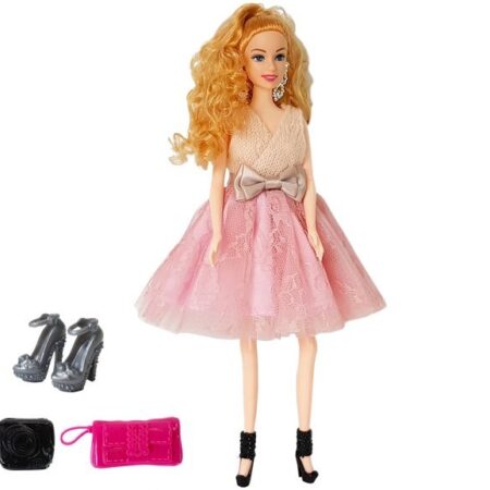 W środku znajduje się piękna, jasnowłosa lalka w jasnoniebieskiej sukni z elementami koronkowymi. Żeby wyglądała jeszcze piękniej to na jej szyi widnieje piękna kolia , różowe szpilki oraz szczotka. W wolnej chwili twoja mała dziewczynka mogła tworzyć niesamowite fryzury. Suknia, w którą jest ubrana idealnie pasuje na imprezę lub bal. Teraz jedynie twoja pociecha musi wyszykować swoją lalkę i oczywiście siebie i wybrać się na wielki bal, na jaki tylko wyobraźnia pozwoli. Twarz lalki ozdobiona jest kobiecym, delikatnym makijażem.