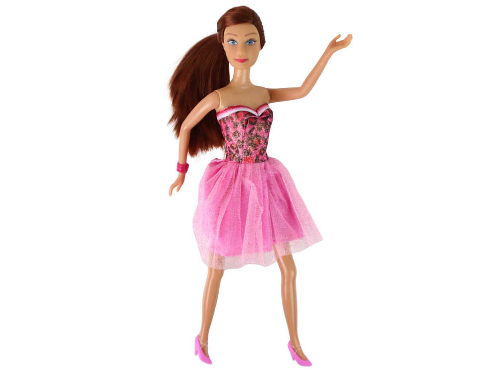 Lucy ubrana jest w uroczą różową brokatową sukienkę. Góra sukienki jest ozdobiona błyszczącym brokatem, który dodaje jej blasku i elegancji. Dół sukienki jest rozkloszowany, co sprawia, że lalka wygląda jak prawdziwa mała księżniczka.