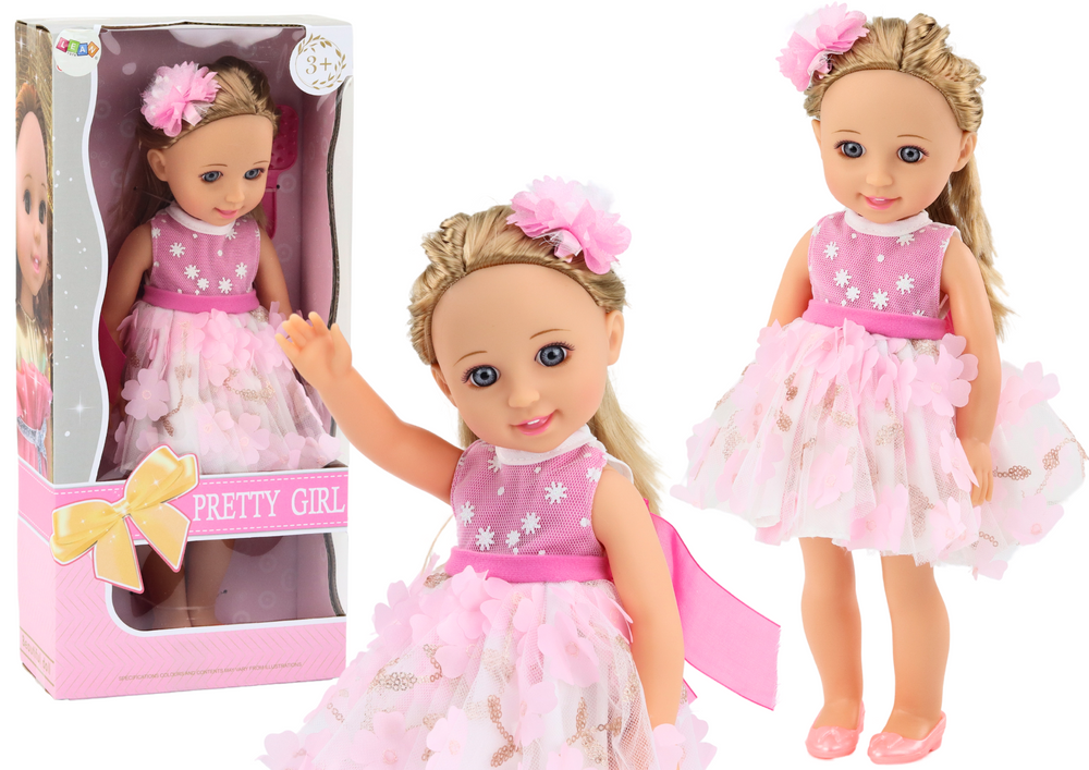 Lalka Różowa Sukienka Długie Włosy Spinka Szczotka 38cm