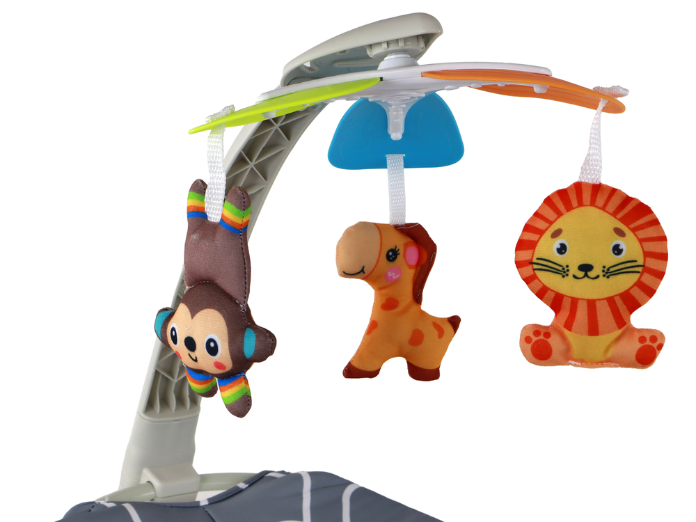 Leżaczek ma wymiary 80 cm x 38 cm x 38 cm, co sprawia, że jest idealny do różnych aktywności. Zestaw zawiera odpinany pałąk z karuzelą z uroczymi zabawkami wykonanymi z miękkiego materiału. Na karuzeli znajdują się 3 zwierzątka, które posiadają w sobie grzechotkę: lew, małpka i żyrafa, które wspaniale stymulują zmysły malucha. Bujaczek to także wesoła żyrafa, która widnieje na materiale bujaka, dostarczając dziecku rozrywki.