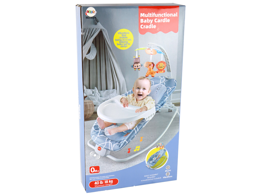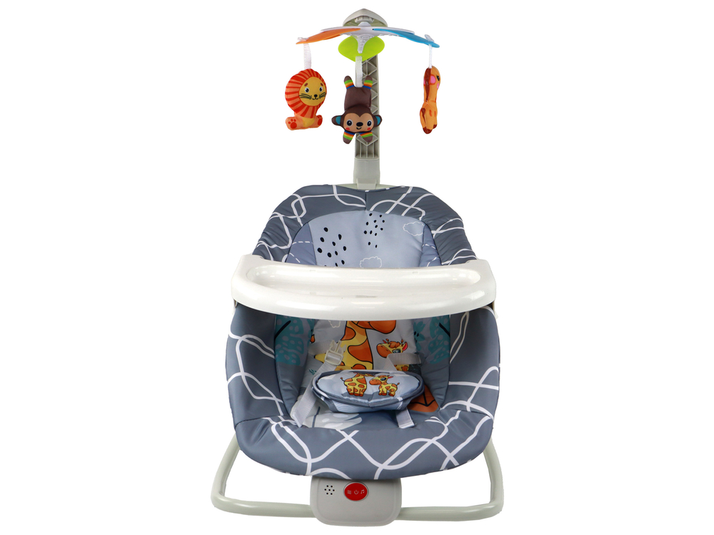 Dla bezpieczeństwa malucha, leżaczek wyposażono w wygodne, białe pasy. Bujaczek działa na baterie (2 x 1.5 V, brak w zestawie) i oferuje różne opcje rozrywki, takie jak piosenki i wibracje, które pomagają dziecku zrelaksować się i zasnąć.