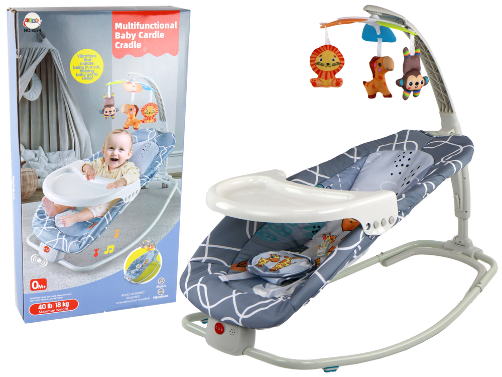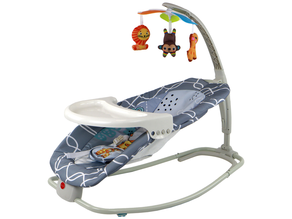 Kolor szary tworzy przyjazne i zachęcające otoczenie. Leżaczek można także przekształcić w stabilny fotelik, rozkładając białą nóżkę oraz rozkładając stoliczek.