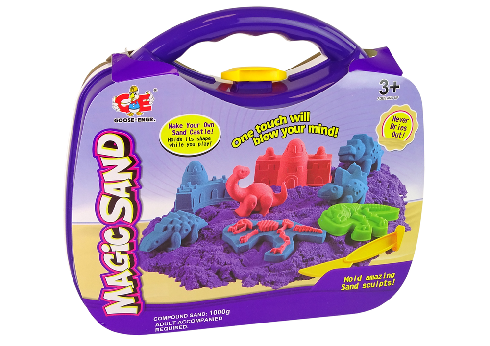 Magiczny piasek kinetyczny jest wyjątkowo plastyczny, można z niego wykonać dowolne, fantazyjne kształty i budowle. Świetnie się skleja, doskonale odwzorowuje kształty foremek i nie rozsypuje się po przybraniu formy. Magiczny piasek nie traci również swoich właściwości, a także doskonale rozwija wyobraźnię, zdolności plastyczne i manualne. Ogromną zaletą dla rodziców jest fakt, że piasek dla dzieci można szybko i bardzo łatwo posprzątać. Wszystko znów dzięki jego magicznym właściwościom kinetycznym – drobinki piasku dla dzieci przyciągają się, a to znaczy, że piasek nie będzie się rozsypywał bezwładnie i kurzył. Piasek kinetyczny nie tylko nie brudzi domu, ale również nie przykleja się do małych rączek i ubranek. Po skończonej zabawie wystarczy schować go do woreczka i po bałaganie.