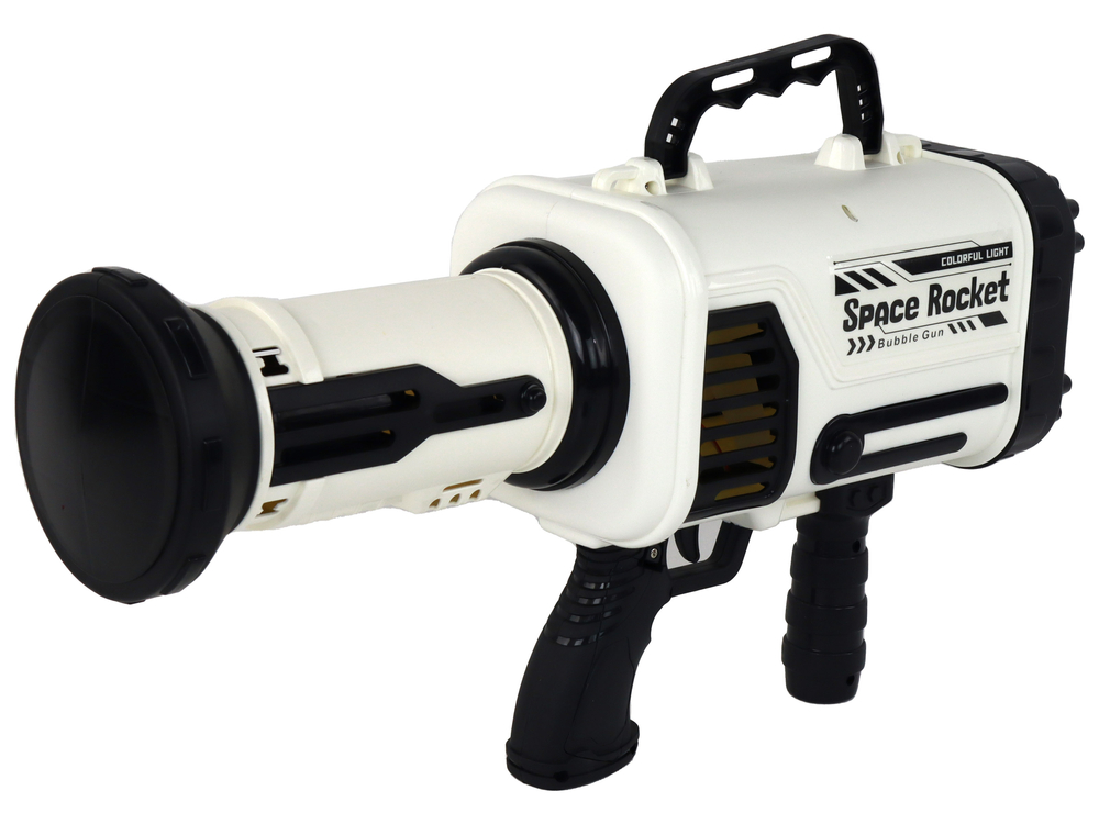 Karabin do baniek mydlanych w kolorze biało-czarnym, ma przyciągający wzrok design. Jest on zaprojektowany w taki sposób, aby przypominał prawdziwy karabin, ale zamiast strzelać pociskami, tworzy piękne bańki mydlane.
