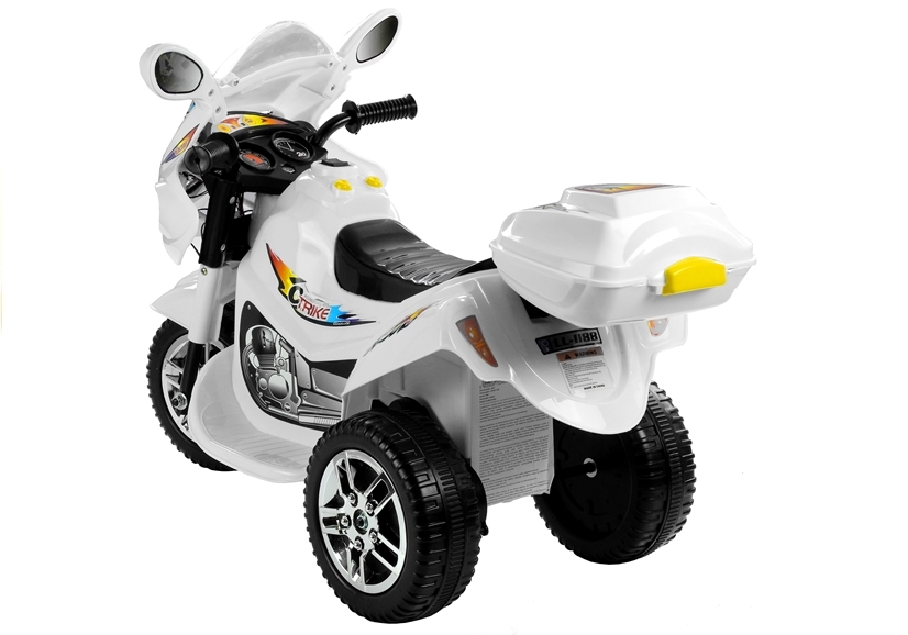 Biała wersja akumulatorowego ścigacza przyciąga wzrok swoją konstrukcją oraz zdobieniami w formie różnokolorowych, kontrastujących naklejek charakterystycznymi dla pełnowymiarowych pojazdów. Na nadwoziu wykonanym z trwałego i solidnego plastiku ABS umieszczono naklejkę imitującą silnik, co z pewnością zrobi wrażenie na każdym dziecku. Wysoce istotnym rozwiązaniem jest także trzykołowa konstrukcja, ułatwiająca prowadzenie pojazdu dzieciom mającym problem z utrzymaniem równowagi podczas jazdy. Zabawa jeszcze nigdy nie była tak prosta!