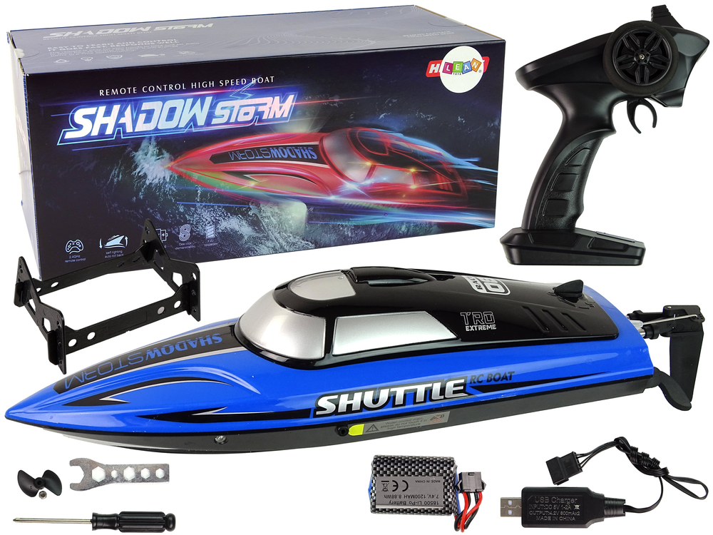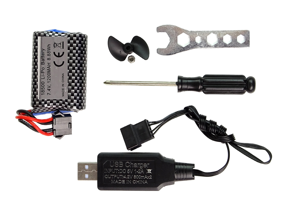 Zestaw zawiera także dodatki takie jak: kabel do akumulatora, klucz, śrubokręt, podstawkę pod motorówkę, która zapewni jej stabilność na lądzie oraz śrubę.