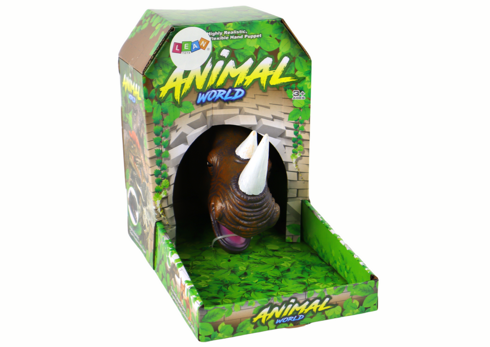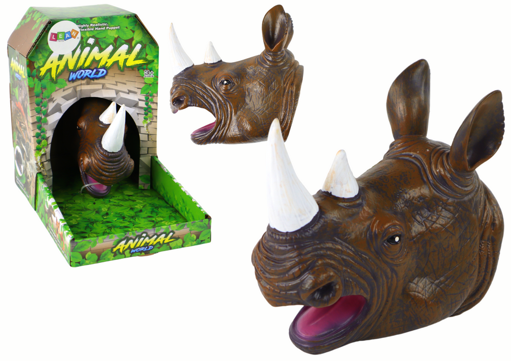 Nosorożec ma charakterystyczne, czarne oczy, które nadają mu autentycznego wyrazu i sprawiają, że wydaje się być żywym stworzeniem. Jednym z jego najbardziej charakterystycznych elementów są jego rogi, które zostały starannie odwzorowane, nadając pacynce autentycznego wyglądu.