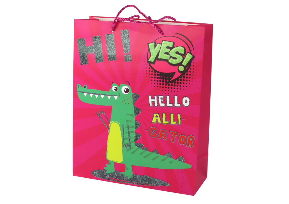 Przedstawiamy naszą Papierową Torbę Prezentową w różowym kolorze z uroczym motywem krokodyla z delikatnym brokatem.