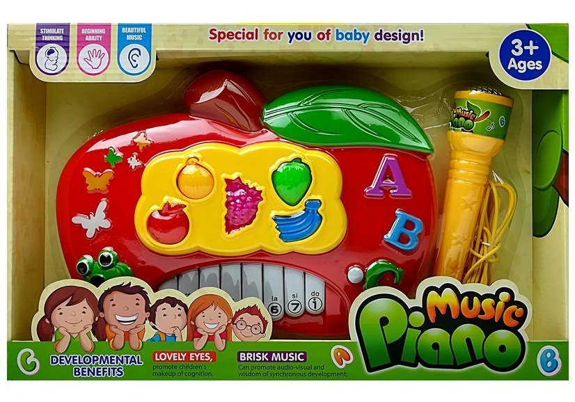 Interaktywne pianinko dla dzieci, które idealnie nadaje się na świetną zabawę podczas śpiewania i tworzenia muzyki. Dodatkowym elementem zestawu jest mikrofon. Pianinko posiada funkcję podłączenie do niego urządzenia np. telefonu i puszczania muzyki. Zabawka jest bardzo starannie wykonana w doskonałych żywych kolorach, które zachęcają do zabawy. Pianinko elektroniczne z mikrofonem sprawi frajdę małemu instrumentaliście. Oferujemy wspaniały instrument muzyczny, dzięki któremu każde dziecko rozwinie swój talent muzyczny oraz wokalny. Najczęściej poprzez zabawę dzieci można zachęcić do nauki gry lub śpiewania.