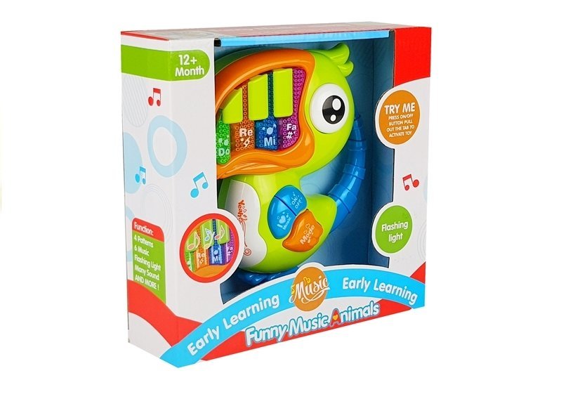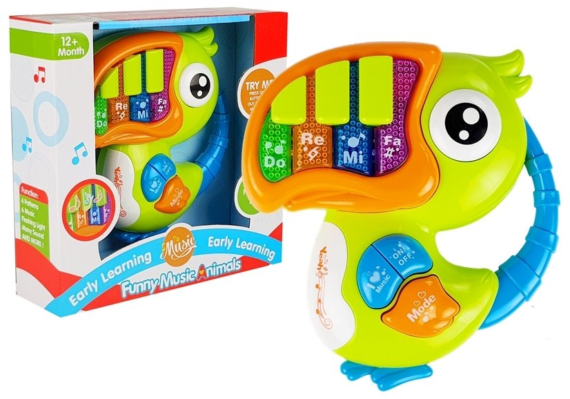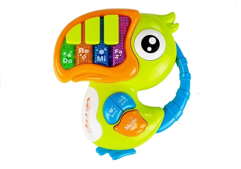 Zabawka składa się z bardzo kolorowej i wesołej konstrukcji. Pianinko w kształcie kolorowej papugi zachwyci każdego malucha.Posiada muzyczne przyciski, a zabawie towarzysza świecące światła przycisków „DO” „RE” „MI”. Zabawkę uruchamiamy przyciskiem ON/OFF. Obok znajduję się przycisk „MODE”, którym zmieniamy tryby dźwięków pianinka. Naciskając na klawisze możemy posłuchać wesołych melodii, odgłosów zwierząt czy standardowych dźwięków pianina odgrywając swoja własna melodię.