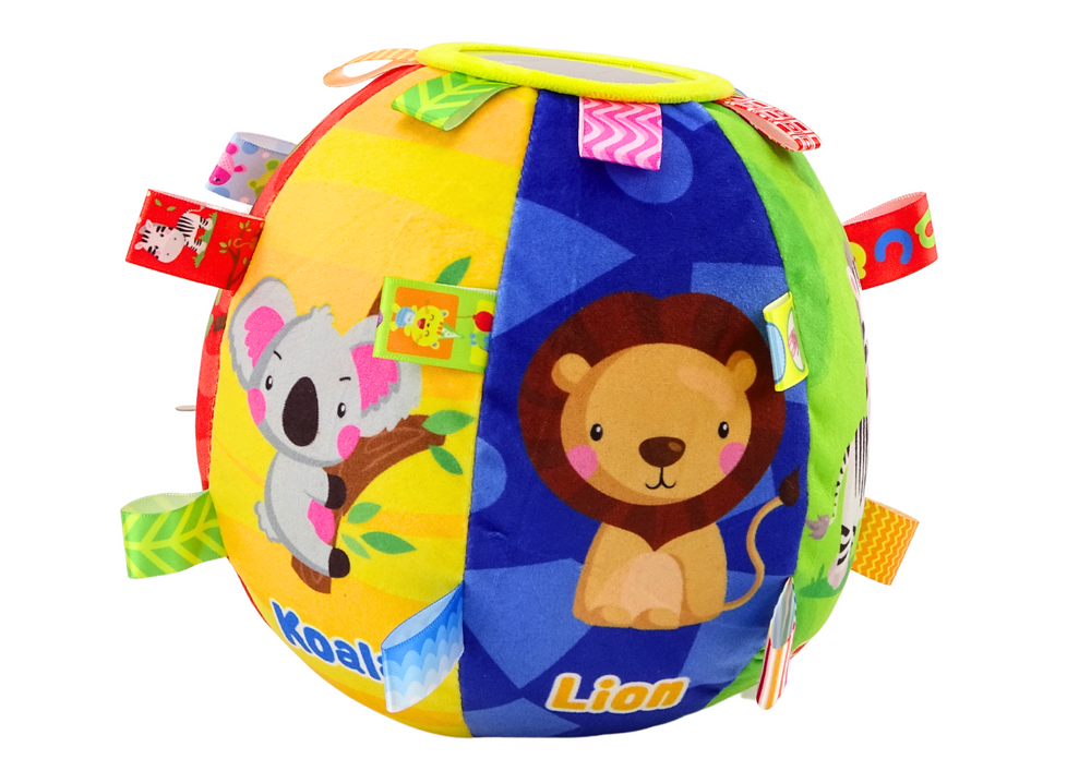 Każde zwierzątko jest podpisane w języku angielskim, co wprowadza element edukacyjny, umożliwiając dziecku naukę nowych słów i rozpoznawanie nazw zwierząt w obcym języku. Na szczycie piłki znajduje się małe lusterko, które pozwala dzieciom na samodzielne odkrywanie swojego odbicia. Jest to ważne dla rozwoju samoświadomości i daje dziecku dodatkową zabawę.