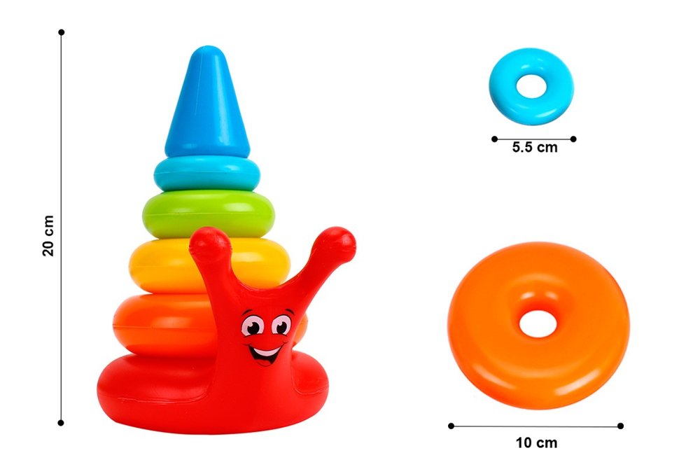 Wesoła Piramidka w kolorach tęczy jest zabawką, która doskonale wpływa na rozwój maluszka. Składa się z obręczy w różnych kolorach o rożnych wielkościach. Na szczycie zabawki znajduje się stożek zamykający piramidkę. Podstawa ma kształt ślimaka – z ładnymi uszami, ogonem i promiennym uśmiechem. Zabawka wykonana jest z bezpiecznego, nietoksycznego materiału, który odznacza się solidnością i wytrzymałością. Piramidka ma bardzo opływowy, zaokrąglony kształt, co wpływa na poziom bezpieczeństwa płynący z korzystania z przedmiotu.