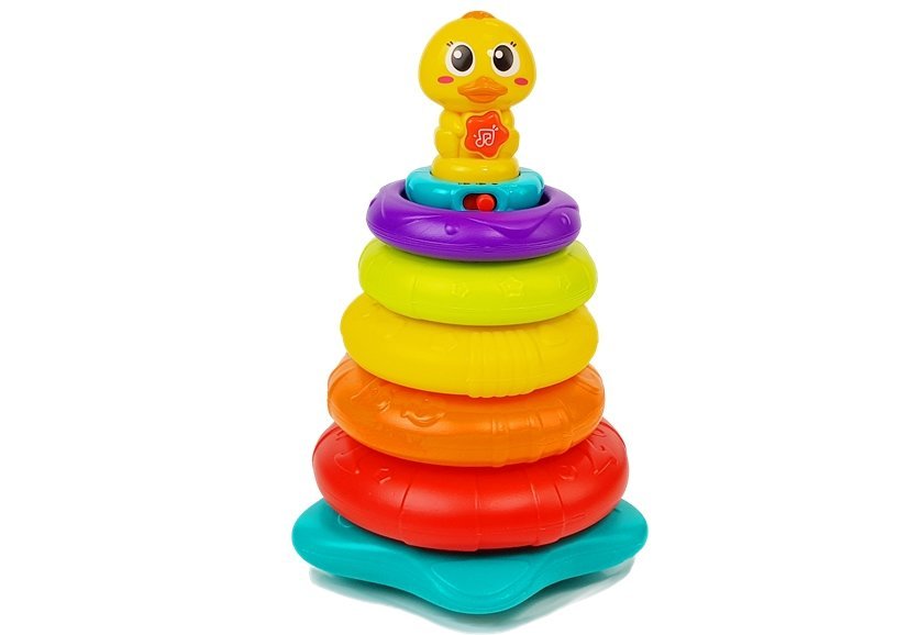 Piramidka z kółek to klasyczna zabawka w bajecznie kolorowej wersji. Rozwija sprawność ruchową dziecka oraz koncentracje, ponieważ musi się skupić na stworzeniu piramidki. Niemowlę dzięki zabawce uczy się rozpoznawać wielkości przedmiotów oraz kolor. Układanie stosu z kółek pomaga w rozwijaniu koordynacji ręka-oko, a nauka dobierania kółek i układania ich od największego do najmniejszego jest świetnym wprowadzeniem do porównywania wielkości. Umieszczona na szczycie piramidy żółta kaczuszka dodatkowo uatrakcyjnia całą zabawę, świecąc i wydając dźwięk. Ta zabawka otworzy dziecku świat wyobraźni, ale rozwinie je na wielu płaszczyznach. To, w jaki sposób można z niej korzystać, zależy tylko od dziecka, jego rodziców i ich wyobraźni. A barwna kolorystyka zaciekawi malucha i przeniesie go w świat zabawy. Po około 6 miesiącach mięsnie niemowląt wzmacniają się i są w stanie wykonywać ćwiczenia, takie jak chwytanie i puszczanie małych przedmiotów. Zabawki takie jak pierścienie do układania są jedne z najlepszych zabawek.