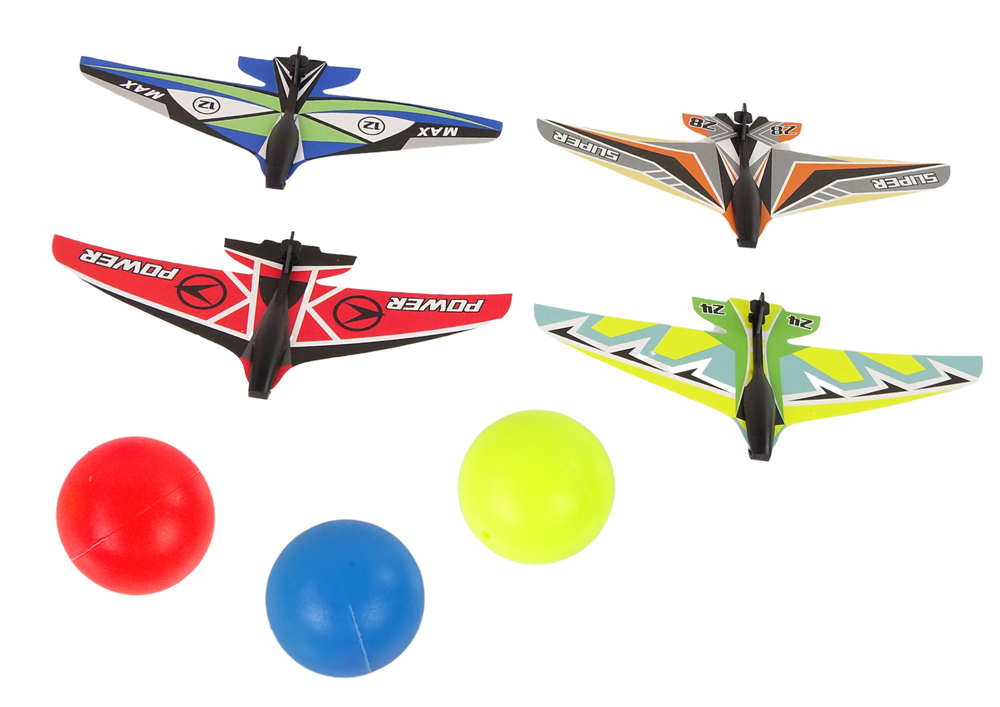 Dzięki swej lekkości samolocik poszybuje na odległość kilkunastu metrów. Każdy fan zawodów strzeleckich mając taką wyrzutnię będzie mógł ćwiczyć najdłuższe loty, a potem urządzić zawody z przyjaciółmi. Drugą opcją zabawy jest wystrzeliwanie kolorowych plastikowych piłeczek. Zestaw zawiera: – wyrzutnia – 4 sztuki samolotów – 3 kolorowe piłeczki