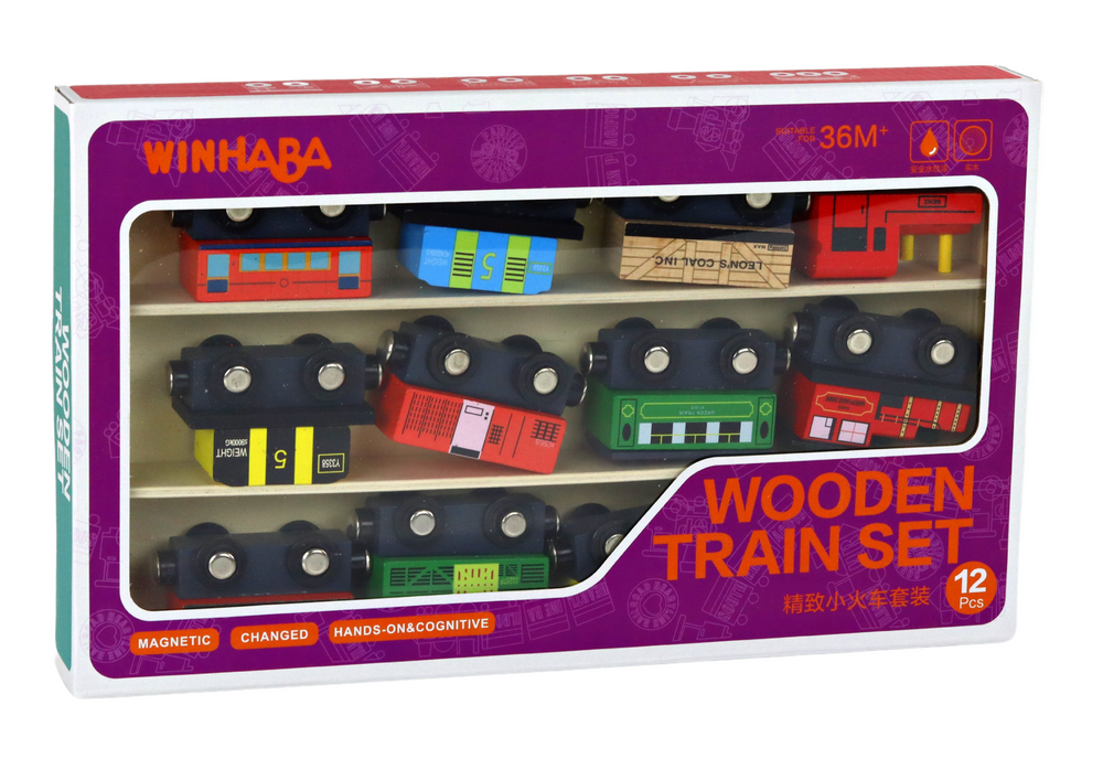 Pociąg Kolejka Drewniana Lokomotywa Na Magnes Wagoniki Zestaw Mix 12 ele.