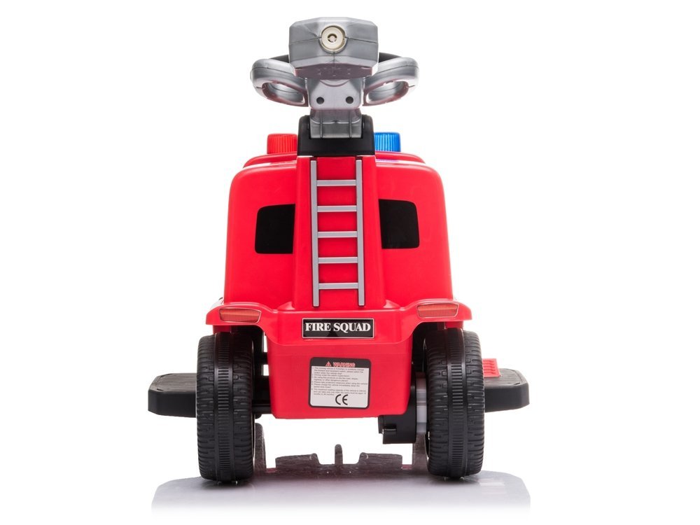 Wyglądem przypomina prawdziwą straż pożarną, dźwięki i światła zachęcą małego odkrywce do zabawy. Po podłączeniu akumulatora możemy traktować go jak prawdziwy pojazd. Podnóżki pozwolą na wygodne ułożenie nóg, a przycisk ze strzałkami umożliwi poruszanie się w przód bądź tył. Jazda równym podłożem będzie niesamowita. Jeszcze jedna dodatkowa funkcja w pojeździe zaskoczy każdego. Z tyłu drabiny znajduje się mała armatka, z której wylatują bąbelki. Wystarczy wlać płynu, nacisnąć przycisk i podziwiać jak bąbelki szybują w powietrze, które pięknie mienią się w różnych kolorach.