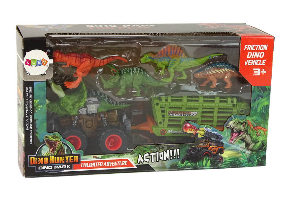 W zestawie znajduje się również zielona przyczepa, która może przewozić 4 różne dinozaury. Każdy z nich reprezentuje inny gatunek, posiada inny kształt i unikalne kolory, co daje dzieciom możliwość tworzenia różnorodnych scenariuszy zabawy.