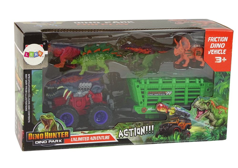 W zestawie znajduje się również zielona przyczepa, która może przewozić 4 różne dinozaury. Każdy z nich reprezentuje inny gatunek, posiada inny kształt i unikalne kolory, co daje dzieciom możliwość tworzenia różnorodnych scenariuszy zabawy.