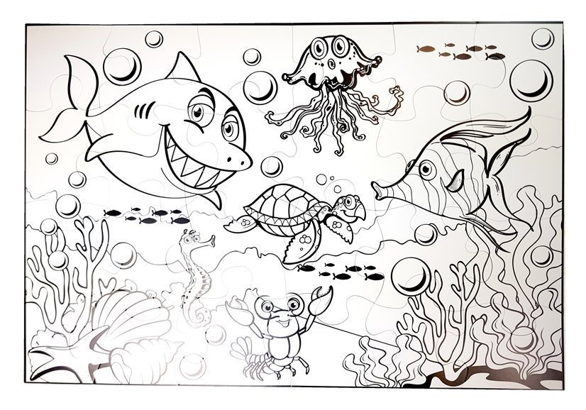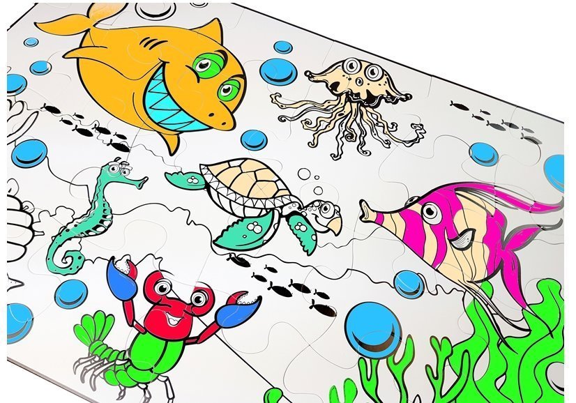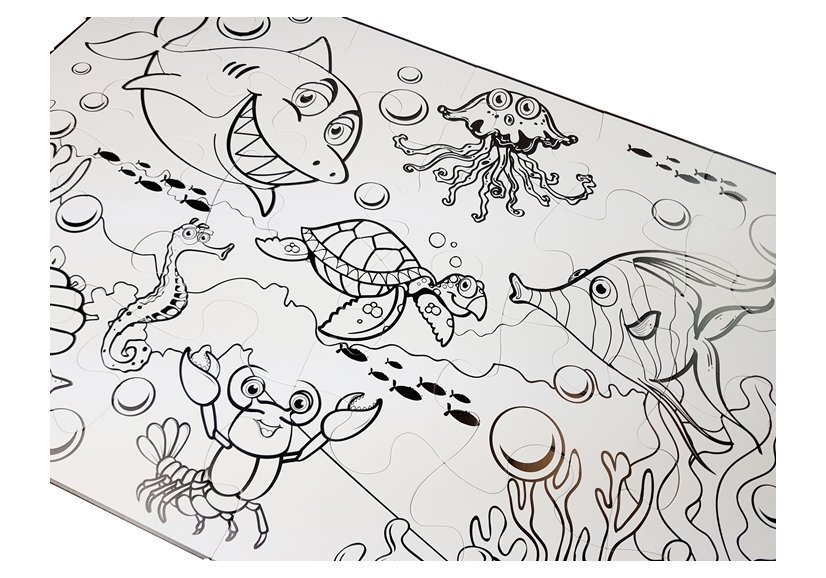 Zestaw składa się z 24 puzzli oraz 12 różnokolorowych pisaków, którymi dziecko może pomalować. Obrazek przedstawia zwierzęta wodne i środowisko, w którym żyją. Na białym tle jedynie zaznaczone są czarne kontury. Będzie mógł poznać wygląd żółwia bądź ośmiornicy i ich otoczenie. Poszerzy przy tym swoją wiedzę, a podczas układania rozwinie swoje zdolności manualne.