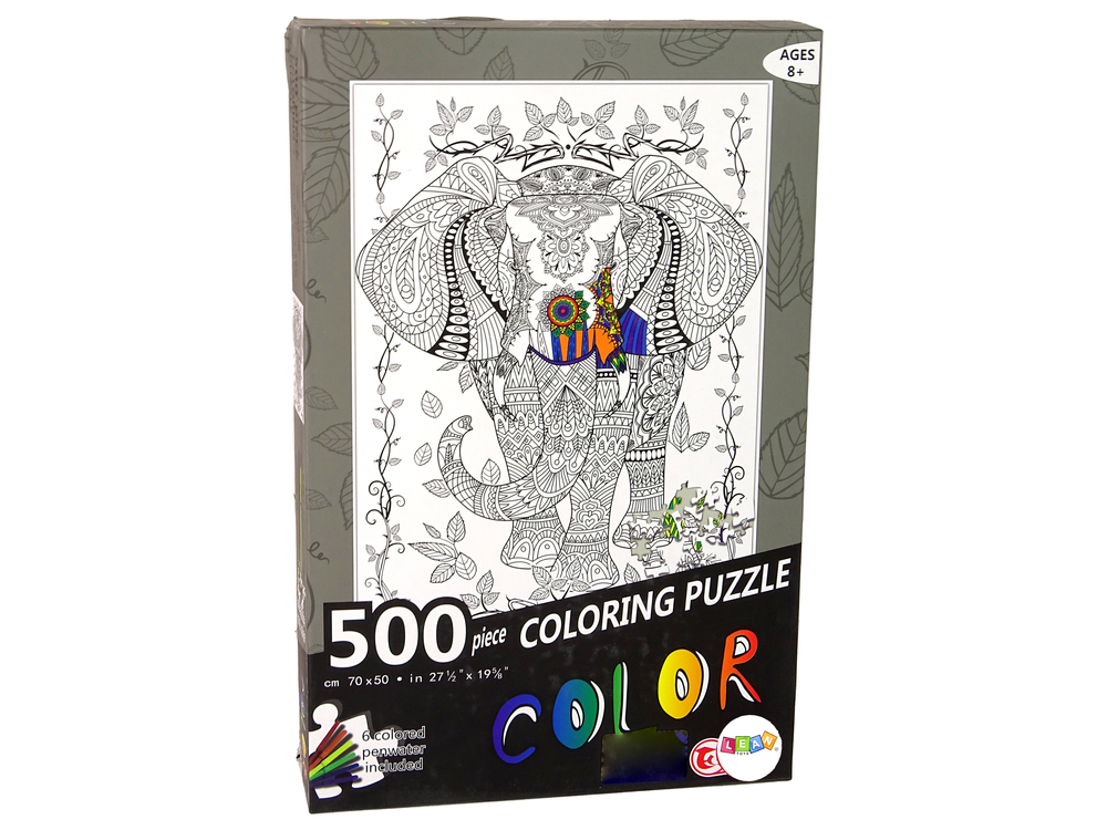 W zestawi znajdziemy 500 sztuk puzzli czarno- białych oraz 6 sztuk pisaków, którymi pomalujesz obrazek tak jak wyobraźnia podpowiada. Puzzle przedstawiają pięknego słonia w otoczeniu liści.