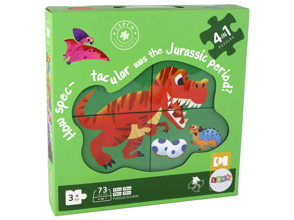 Fascynujący zestaw puzzli dla dzieci o nazwie Puzzle 4 w 1 Dinozaur. Ten zestaw zawiera aż 73 puzzle, które zapewnią godziny zabawy i rozwijającej rozrywki.