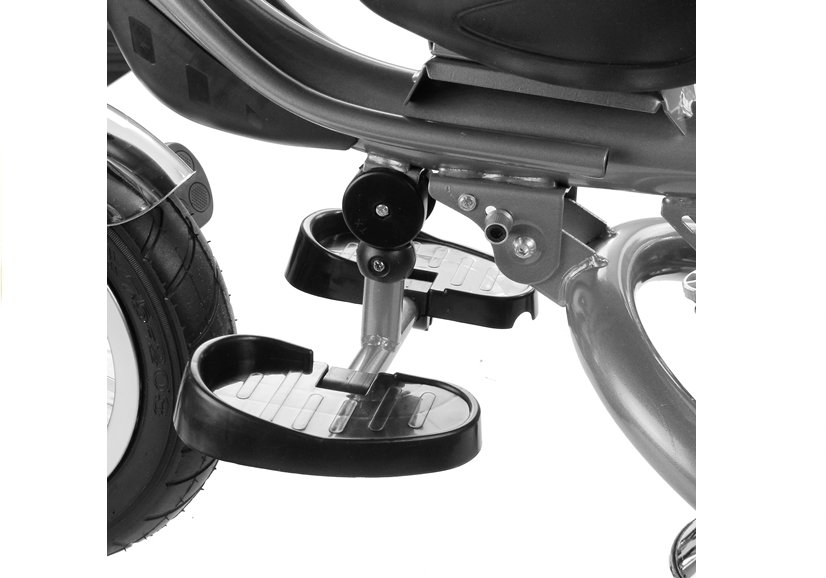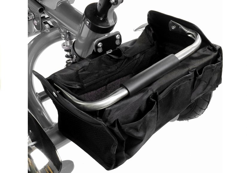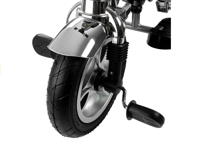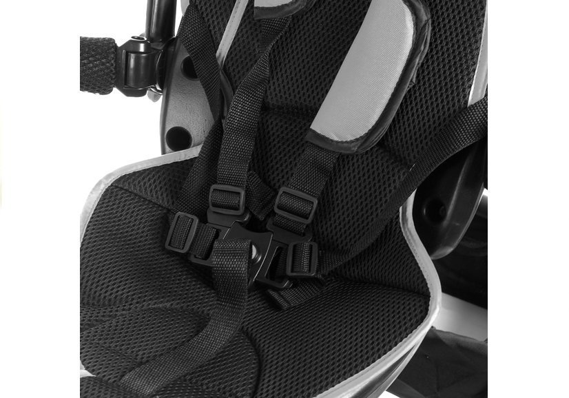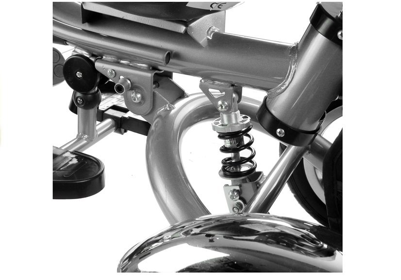 Dużą zaletą prezentowanego trójkołowca jest solidna i trwała rama , którą połączono z czarnymi detalami. Uwagę przechodniów zwrócą błyszczące, chromowane błotniki umieszczone nad każdym z kół, w pełni rozkładany baldachim z daszkiem chroniący przed ostrym słońcem lub wiatrem, w którego górnej części umieszczono siateczkę zwiększającą przepływ powietrza i miękki, dopasowany kolorystycznie pokrowiec na siedzisko połączony z szelkami i pasem bezpieczeństwa.