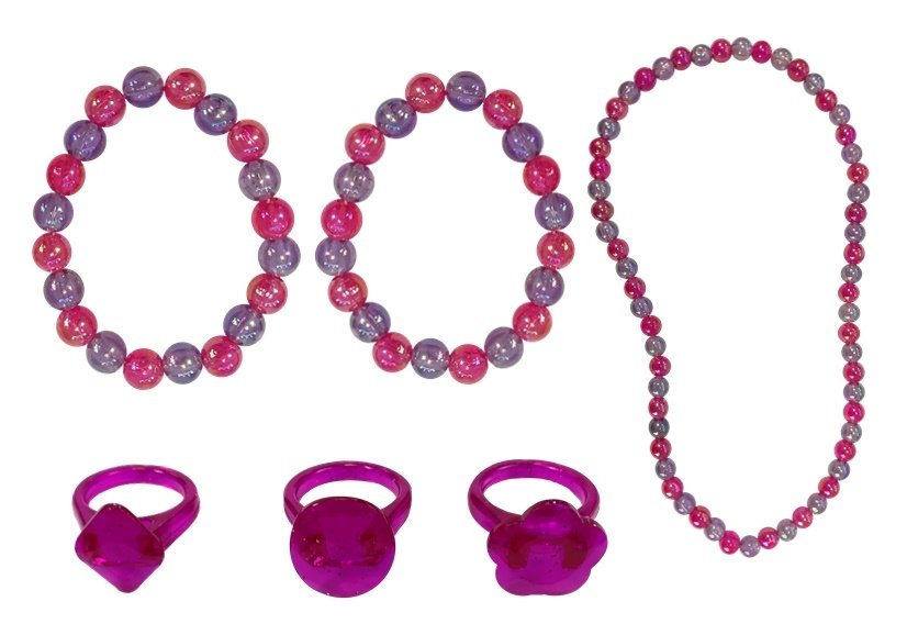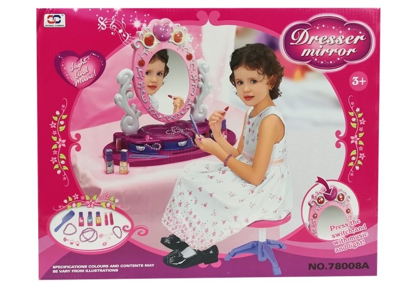 Ten zestaw piękności to urocza zabawkowa toaletka utrzymana w dziewczęcych barwach. Wyposażona jest w 3 szufladki na biżuterię, a także w duże lusterko. Wciśnięcie przycisku znajdującego się na szczycie lusterka powoduje uruchomienie się oświetlenia wbudowanego w jego ramę. Do zestawu dołączona jest zabawkowa biżuteria, taka jak różowe pierścionki czy naszyjnik z koralików. Na wyposażenie toaletki wchodzą także zabawkowe perfumy i szminki oraz grzebień.
