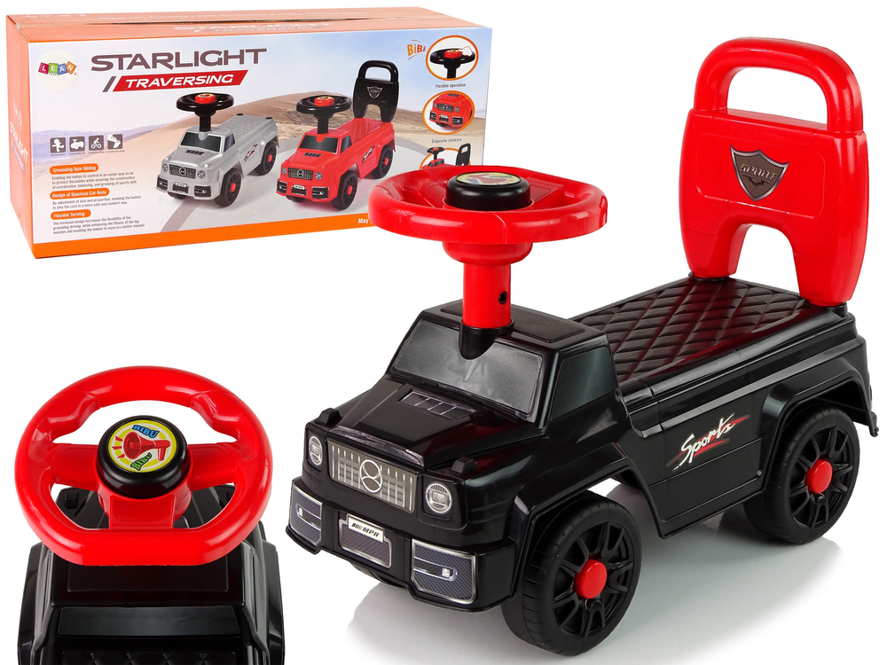 Jeździk to wielofunkcyjna zabawka dla malucha. Przeznaczony dla dziecka, które potrafi samodzielnie odpychać się od podłoża nóżkami. Zabawkowy samochód będzie rosnąć razem z dzieckiem i jego umiejętnościami. Odpychacz doskonale sprawdzi się zarówno w domu, jak i na podwórku czy w ogrodzie. Wykorzystanie w codziennej zabawie prezentowanego pojazdu dla kilkulatka w ogromnym stopniu wpływa na jego rozwój. Jeździk wspiera koordynację wielu części ciałka dziecka jednocześnie, rozwijając także mięśnie, a co równie istotne — wspomagając naukę samodzielnego, stabilnego chodzenia. Jazda czarnym samochodzikiem do odpychania pozwoli dziecku zrozumieć, czym jest prędkość, odległość czy kierunek.