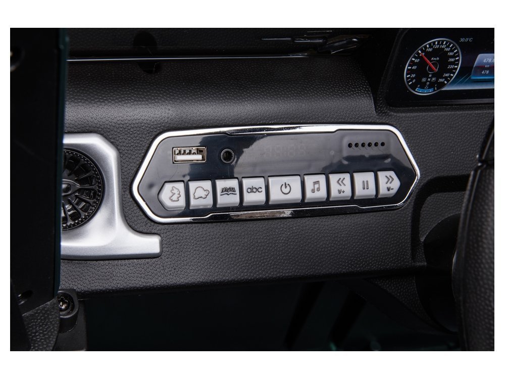 Wewnątrz Mercedesa umieszczono miękką kanapę wykończoną pikowaną ekoskórą oraz regulowane pasy bezpieczeństwa. Na desce rozdzielczej znajduje się na obrotowa kierownica sygnowana logo z trójramienną gwiazdą, imitacje wskaźników, między innymi prędkościomierza i obrotomierza, czy panel muzyczny z wejściem USB lub MP3. Rozwiązanie to uprzyjemni każdą podróż, pozwalając poczuć się maluchowi jak w prawdziwym aucie.