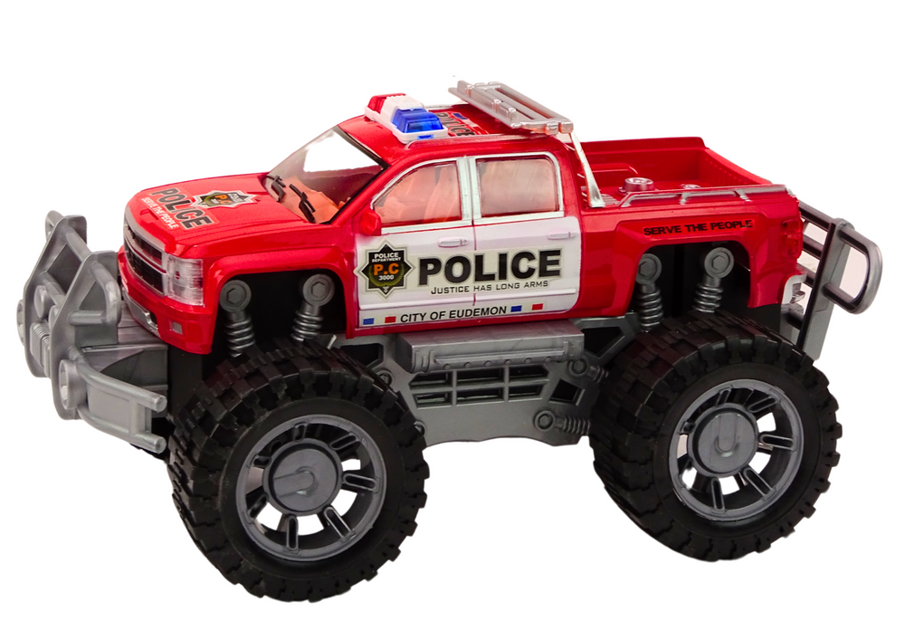 Auto posiada napęd, dzięki czemu po przekręceniu tylnych kół samochód pojedzie samodzielnie. Całość konstrukcji oraz detale sprawiają, że zabawka ta przypomina prawdziwy terenowy samochód policyjny, co z pewnością zachwyci małych miłośników motoryzacji i policji.