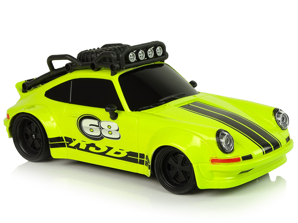 Samochód ma lekką i solidną konstrukcję, sportowy design z czarnymi pasami na dachu i masce samochodu. Wygląd zewnętrzny robi wrażenie. Na dachu znajduje się rama z kołem zapasowym i reflektorami. Podczas szybkiej jazdy nic nie zaskoczy. Gumowe opony gwarantują przyczepność do podłoża. Prowadzenie pojazdu to świetna zabawa, szczególnie dla najmłodszych. Mogą oni sterować małym modelem samochodu za pomocą pilota dołączonego do zestawu, posiada dwa oddzielne przyciski do jazdy do przodu/do tyłu i na boki.