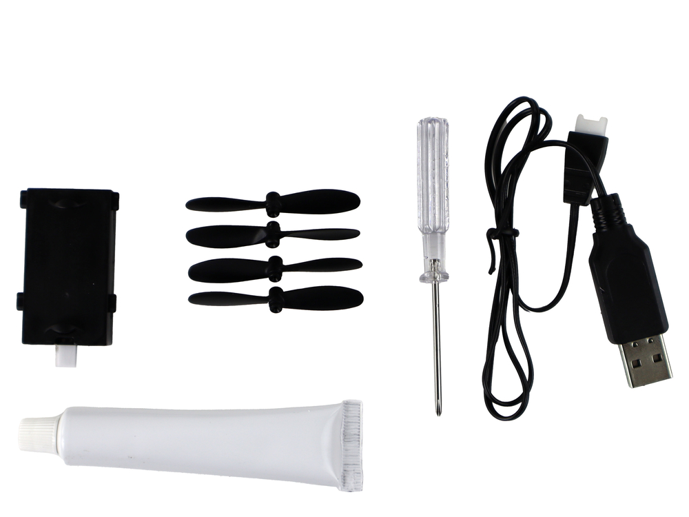 W zestawie dołączone są również cztery wymienne śmigła, kabel do ładowania, śrubokręt oraz klej.