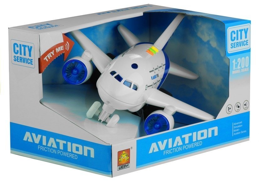Samolot pasażerski zasilany jest 3 sztukami baterii AG13, które są dołączone do zestawu. Zabawka posiada certyfikat CE, wykonana jest z bezpiecznego dla dzieci, solidnego i trwałego materiału, który jest gwarancją długiej żywotności. Przedmiot zapakowany jest w estetyczne pudełko z witrynką, co sprawia, że będzie rewelacyjnym prezentem dla dziecka.