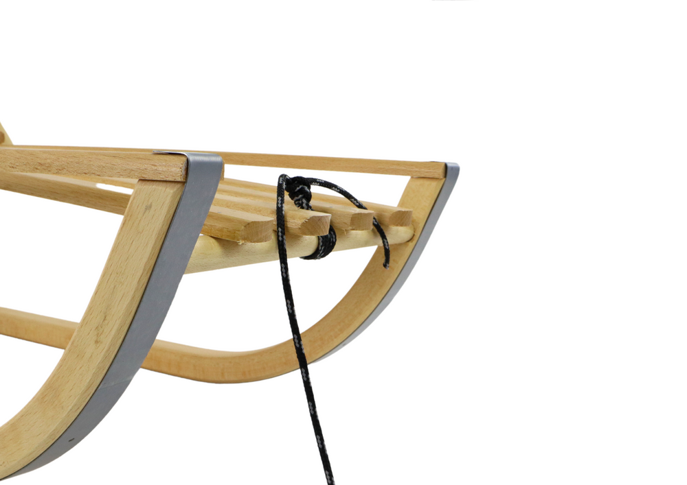 Sznurek jest zakończony drewnianym uchwytem, co ułatwia jego trzymanie. Drewniany element nie tylko pełni funkcję praktyczną, ale również dodaje estetyki i współgra z naturalnym charakterem sanek