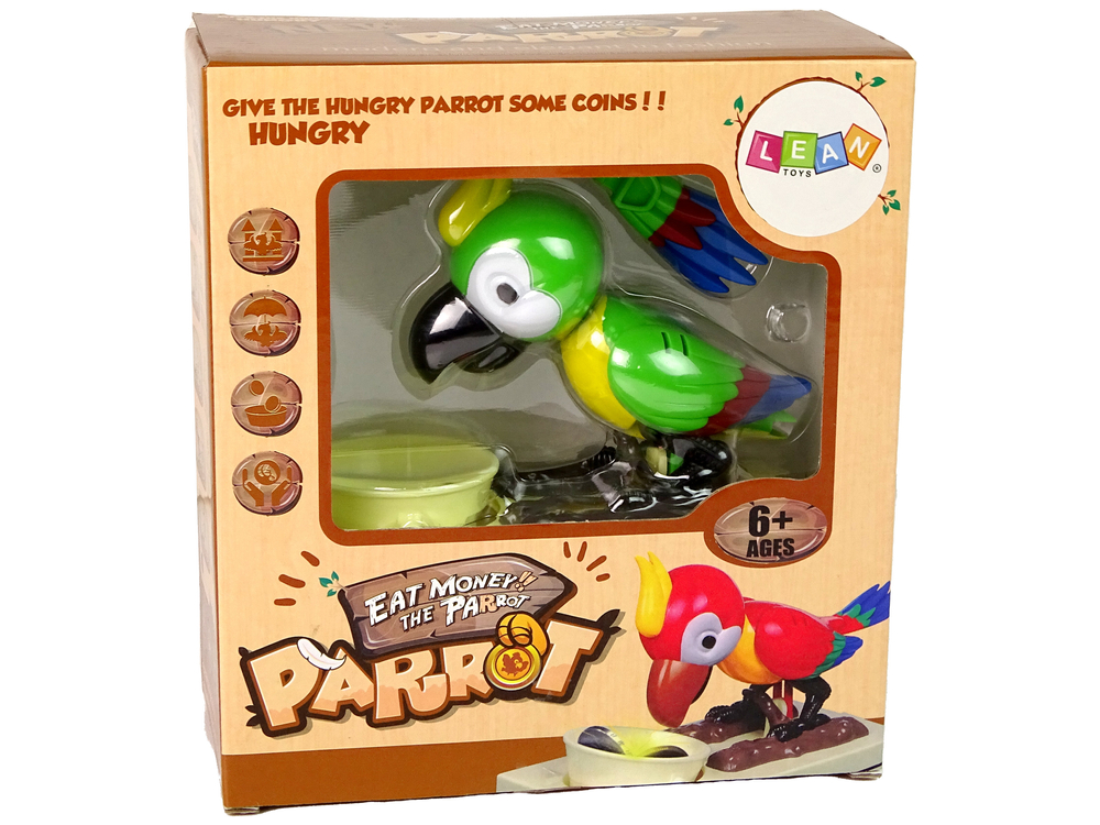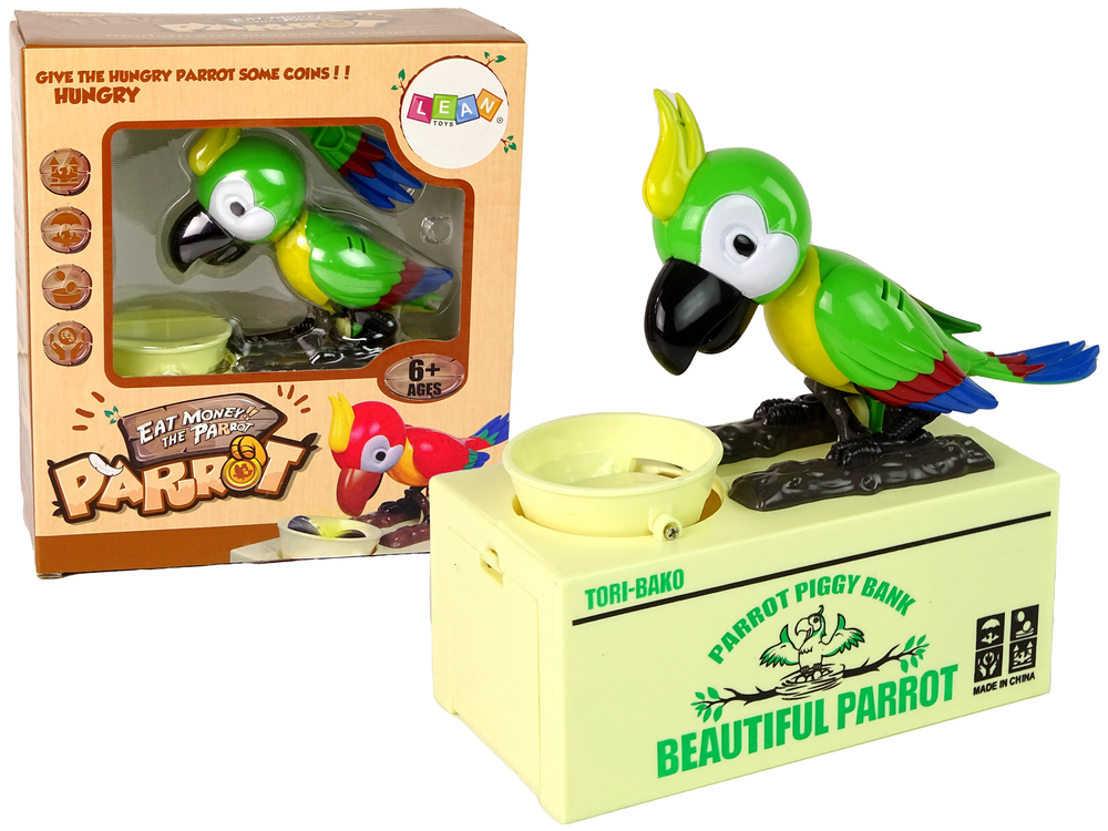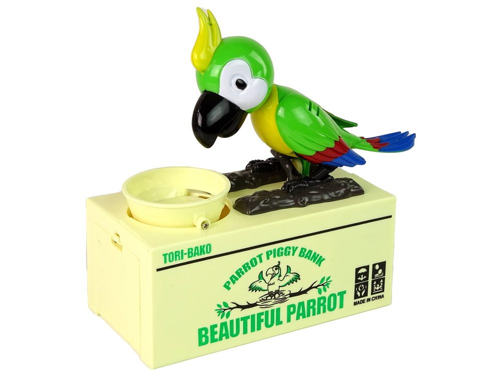 Papuga posiada ruchome kończyny, jest znacznie ciekawsza niż zwykła skarbonka. Wystarczy, że umieścisz pieniążek w misce, a papuga zacznie ją szybką wylizywać, wrzucając go do skarbonki.