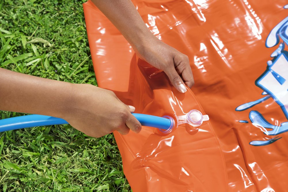 Dwuosobowy ślizg zapewni klasyczną, ponadczasową zabawę na podwórkach dla wszystkich dzieci w wieku powyżej 3 lat. Będzie to idealna forma spędzenia wolnego czasu i ciekawa rozrywka. Ślizgawkę wystarczy rozwinąć, przytwierdzić do podłoża i podłączyć wąż ogrodowy. Dzięki dołączonym do zestawu specjalnym zabezpieczeniom ślizgawka nie będzie się przesuwała. Ślizg o długości 4,88 m jest idealny do samotnych prób szybkości lub zabawy na zmianę z przyjaciółmi. Lejki wodne w baseniku na końcu powodują lądowanie z wielkim pluskiem na linii mety. Wbudowane spryskiwacze są specjalnie zaprojektowane w celu bardziej wydajnego pokrycia i zapewniają efekt kaskadowy, utrzymując śliski tor.