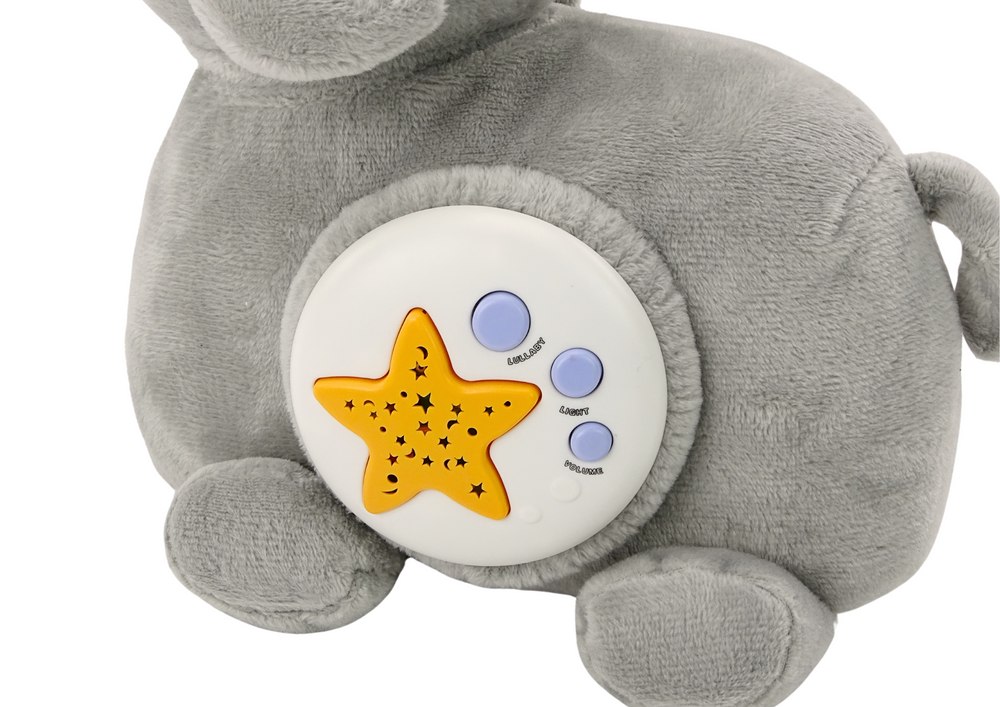 Zabawka pluszowa projektor słonik to uroczy i funkcjonalny przyjaciel dla każdego malucha. Ta zabawka jest w kształcie miękkiego pluszowego słonika, który przytuli każde dziecko do snu. Na brzuszku słonika znajduje się projektor gwiazd, który w magiczny sposób rozświetla pokój, tworząc uspokajającą atmosferę do zasypiania. Słonik wyposażony jest w trzy przyciski, z których każdy ma inną funkcję.