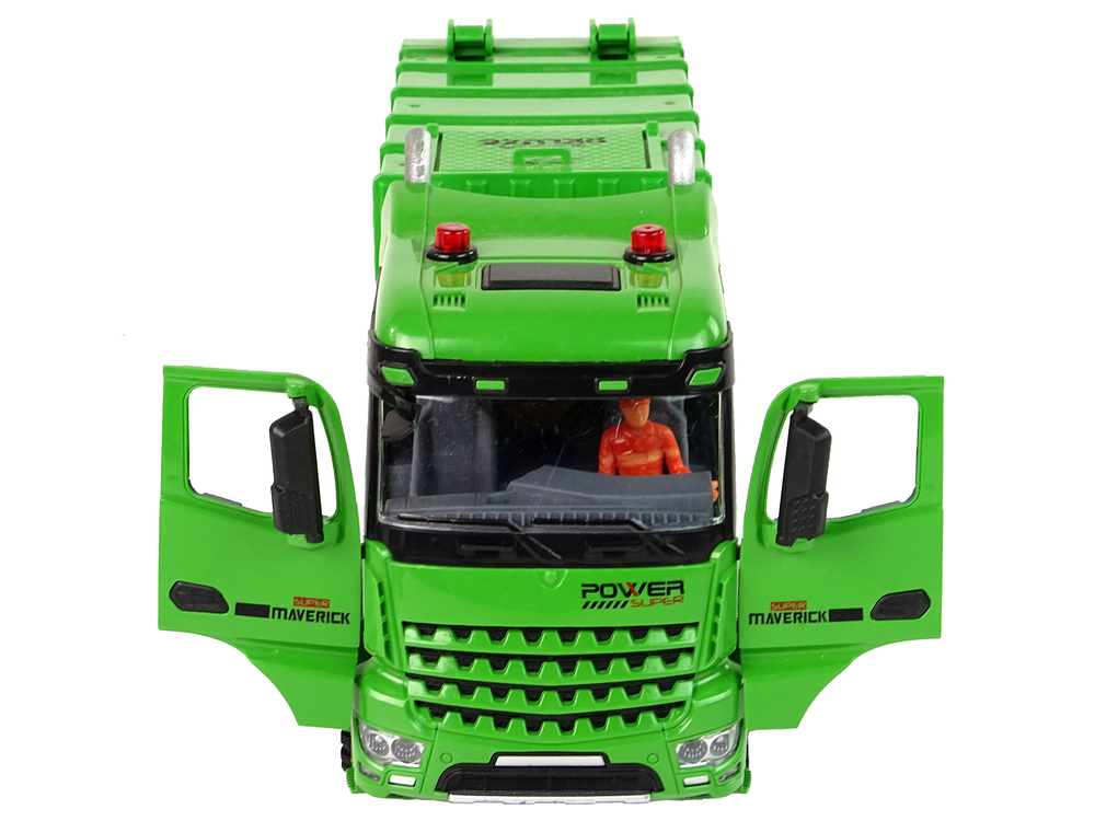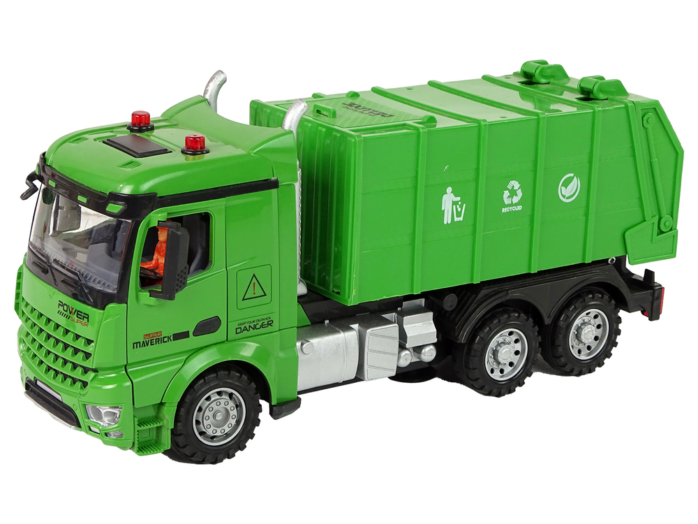 Śmieciarka przypomina miniaturową wersję. Zielony kolor i naklejki nawiązują do przeznaczenia pojazdu .Posiada wiele funkcji, które dodają realizmu i wrażeń z korzystania z pojazdu. Dziecko może odkrywać różne tereny i zbierać śmieci w każdym zakamarku używając do tego zdalnego sterowania.