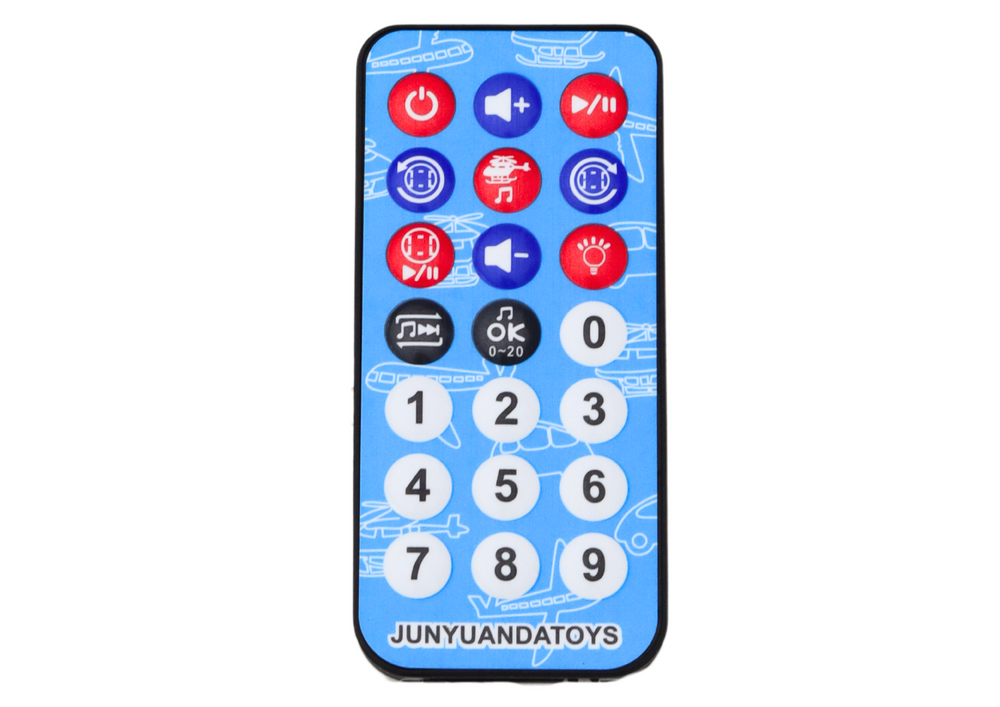 W zestawie znajduje się pilot, który pozwala na włączanie i wyłączanie helikoptera, zmianę świateł i dźwięków. Dodatkowo, na pilocie znajdują się cyfry od 1 do 9 w języku angielskim, co umożliwia dzieciom naukę cyferek w zabawny sposób.