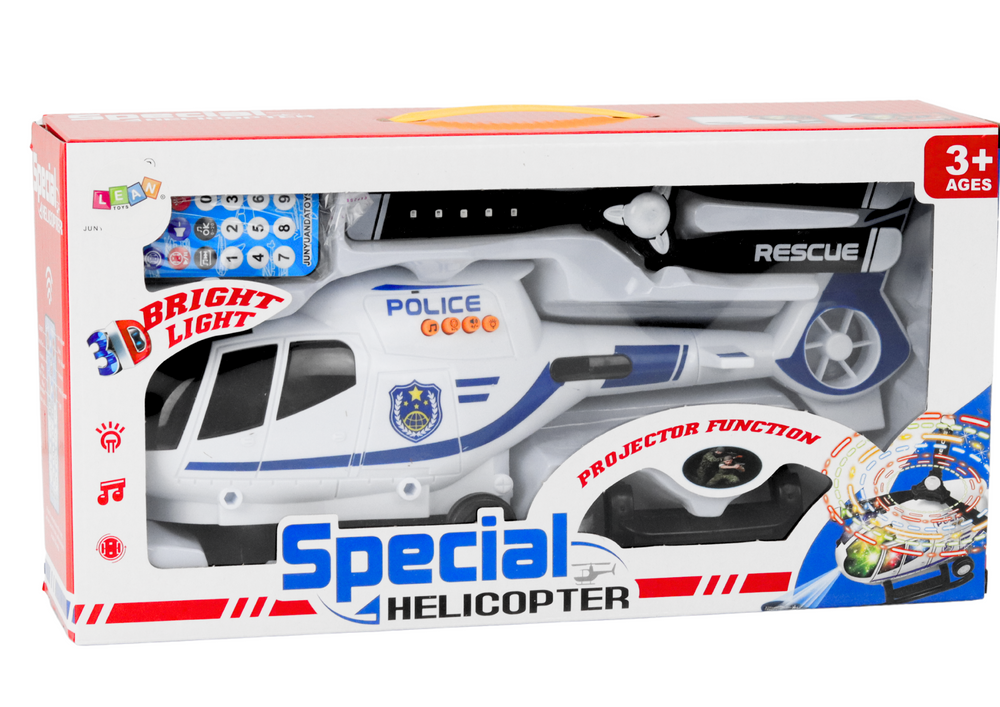 Helikopter jest w kolorze białym z niebieskimi dodatkami, co nadaje mu autentyczny i atrakcyjny wygląd policyjnego pojazdu. Stylowe wykończenie i realistyczny design sprawiają, że zabawka wygląda jak prawdziwy helikopter. Śmigło helikoptera świeci i kręci się podczas jazdy, co dodaje zabawie dynamizmu i atrakcyjności wizualnej. Helikopter porusza się samodzielnie, a zaawansowany mechanizm pozwala mu omijać przeszkody i obracać się podczas jazdy, co zwiększa realizm i interaktywność zabawy. Zabawka odtwarza realistyczne dźwięki helikoptera policyjnego, takie jak odgłos silnika i syreny, co wzmacnia wrażenia z zabawy.