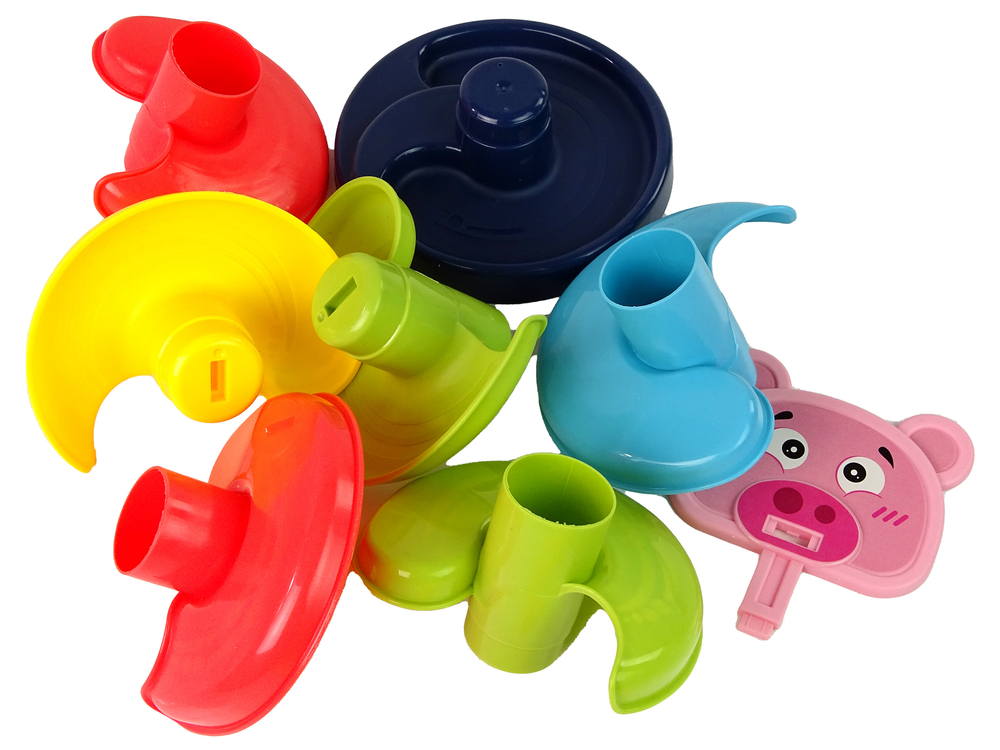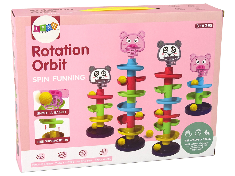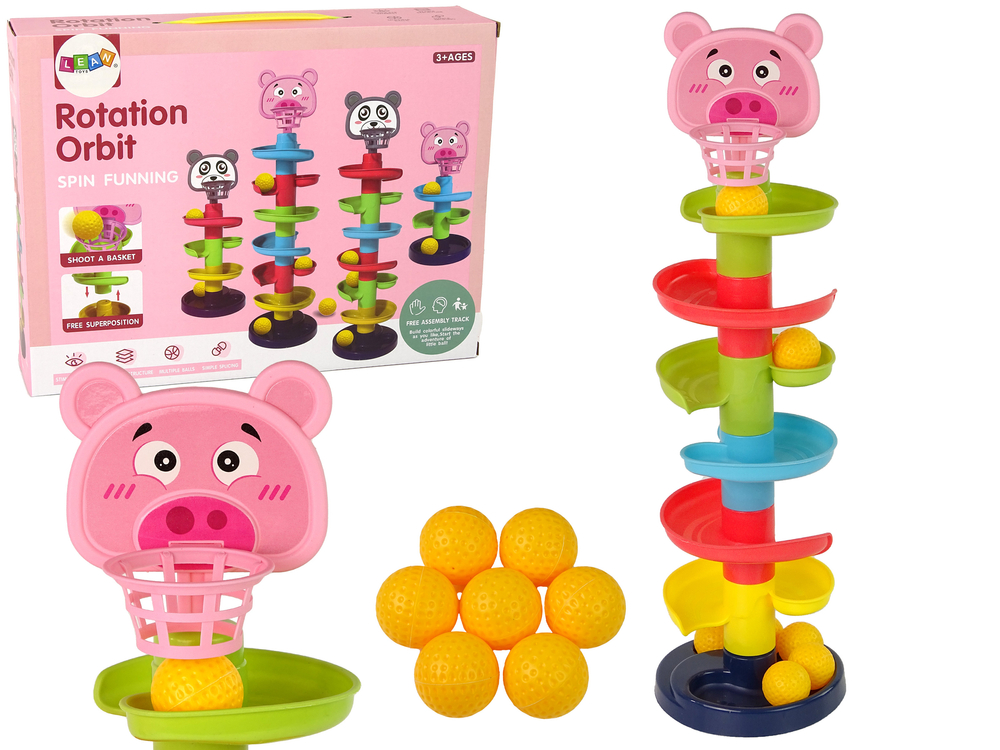 Kolorowa zjeżdżalnia dla piłeczek to świetna zabawa, która nauczy Twoje dziecko, w jaki sposób kuliste kształty poruszają się po pochyłych powierzchniach. Żółte kulki wydają przyjemne dźwięki w trakcie turlania. Zjeżdżalnia składa się z 6 kolorowych poziomów, które musi pokonać położona przez dziecko piłeczka. Na czubku znajduje się mała świnka z koszem. Maluch, bawiąc się, będzie próbował trafić do kosza, ćwicząc przy tym koordynację, celność i zdolności manualne.
