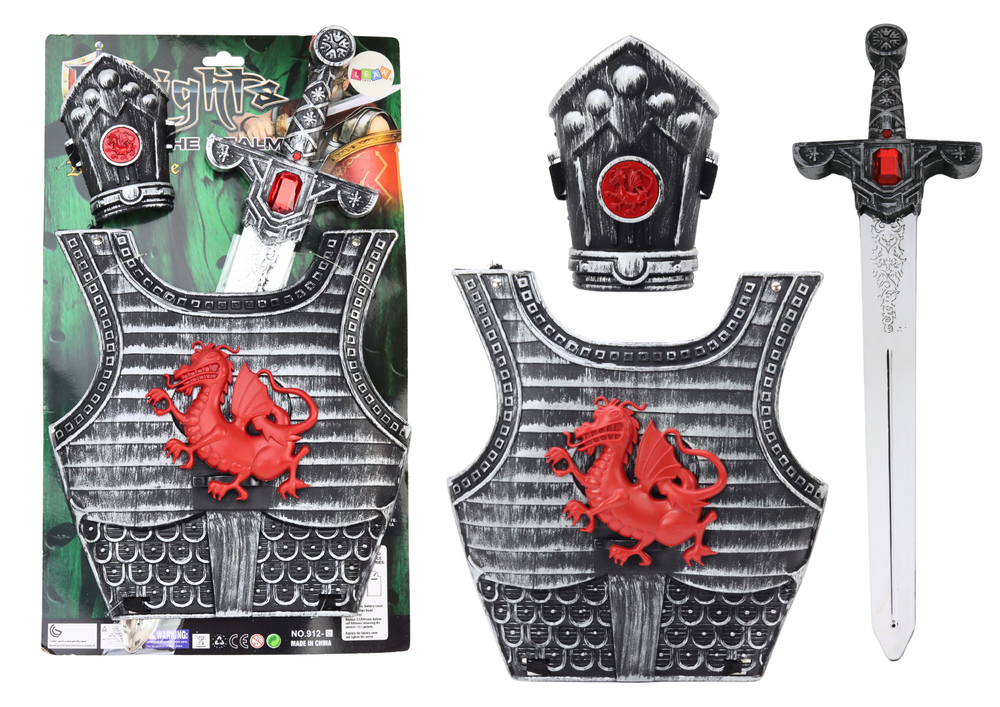 Miecz i zbroja są głównymi elementami zestawu, prezentując się imponująco w kolorze brązowo-srebrnym, co dodaje im szlachetności i autentyczności. Na tarczy widnieje czerwone logo smoka, które dodaje charakteru i wyrazistości, podkreślając motyw rycerski. Miecz natomiast zachwyca swoją solidną konstrukcją i realistycznym wyglądem, pozwalając na dynamiczne pojedynki w świecie fantastycznych opowieści. Posiada efekty dźwiękowe, sprawiają, że zabawa nim jest niezwykle ekscytująca i pełna emocji.