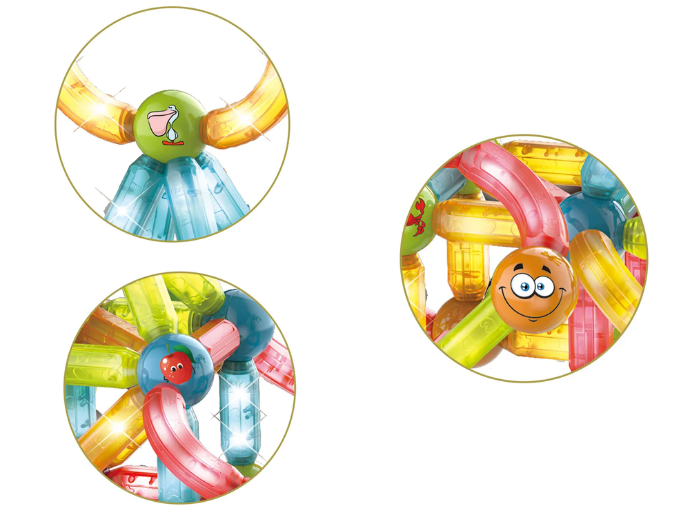 Zbuduj tor, gdzie znajdują się rampy, pętle i przeszkody, które dziecko może dowolnie łączyć i układać. Każdy klocek na końcu posiada magnesy lub zatrzaski, które przyciągają się i umożliwiają tworzenie trójwymiarowych konstrukcji, po których będzie mknęła mała świecąca kulka.